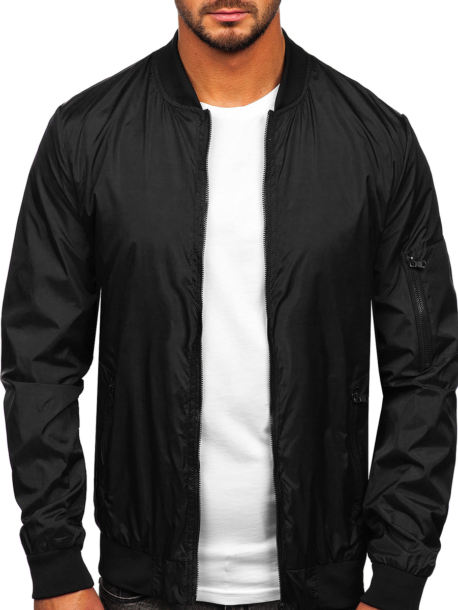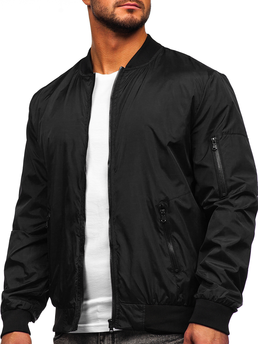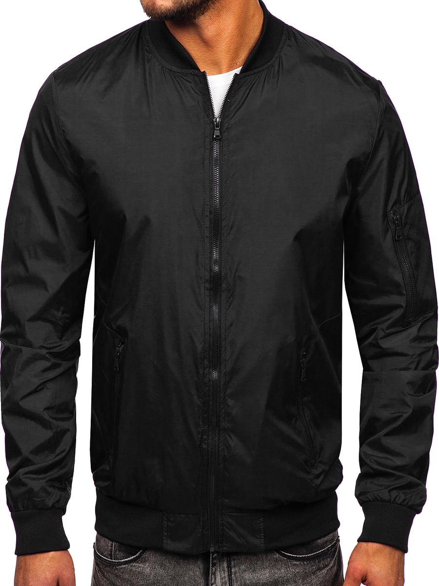 Fekete színű, átmeneti, férfi bomber dzseki -Bolf 8M97- egy őszi és tavaszi klasszikus. Ez a dzseki cipzárral zárható. álló típusú gallérral rendelkezik, passzéval. Az ujjai és az alsó része rugalmas szegéllyel van ellátva, ennek köszönhetően a dzseki jól idomul az alakhoz. Bomber jacket típusú dzseki, két külső cipzározható zsebbel, amelyekben a legfontosabb tárgyaidat tárolhatod. Az univerzalitásnak köszönhetően nagyszerűen mutat sportos és casual outfitekben. Sportos kinézetet biztosít pólóval, pulcsival és joggerrel. Nagyszerűen mutat casual stílusban is, farmerral és pulóverrel .