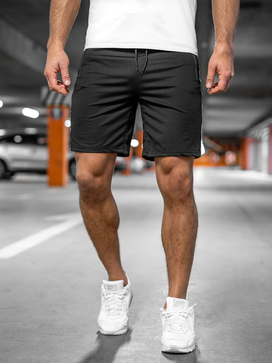 Fekete színű, férfi rövid szabadidőnadrág -Bolf 68024- derékban erős szűkítővel és megkötővel állítható, nagyszerűen alakra szabott. Két praktikus, külső, cipzározható zsebbel. A magas minőségű anyagból készült, ennek köszönhetően kényelmet biztosít minden helyzetben. Dekoratív eleme a divatos szalag oldalt. Kiváló termék azoknak, akik értékelik a szabad mozgást és a kényelmet. Nagyszerűen mutat edzőteremben vagy jogging közben. Sportos kinézetet biztosít pólóval és pulcsival. Fantasztikusan mutat egy farmerdzseki és egy rövidnadrág főszereplésével.