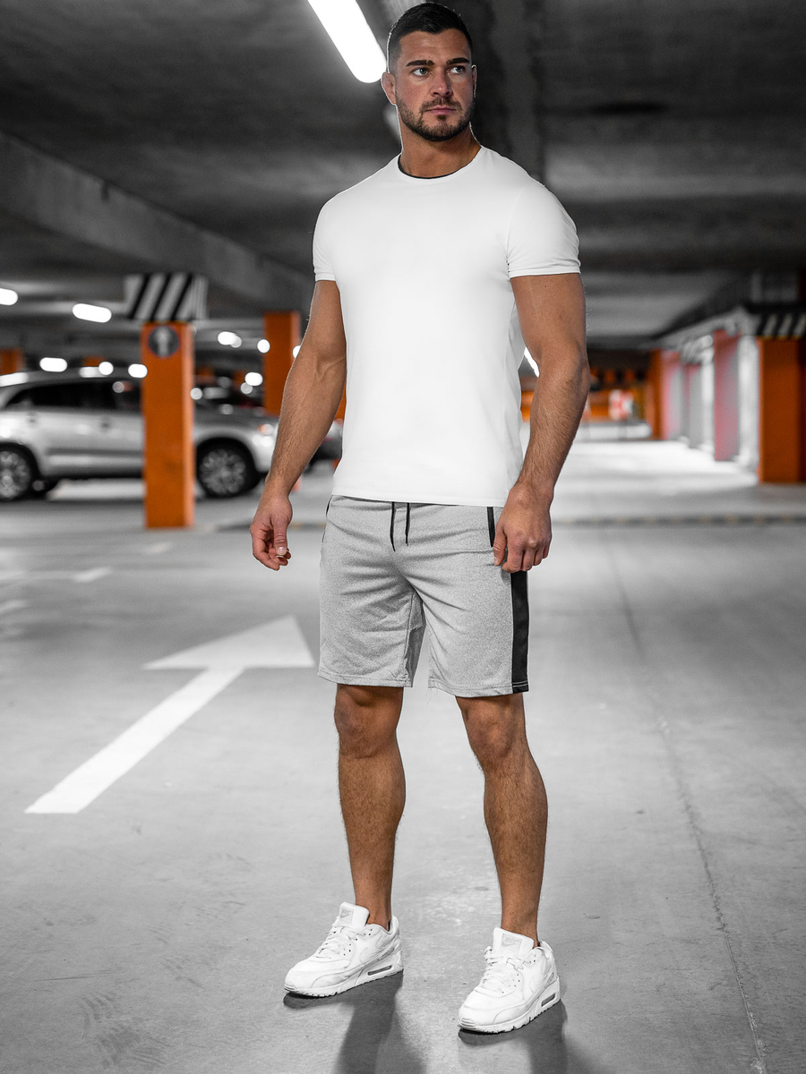 Szürke színű, férfi rövid melegítőnadrág -Bolf 68040 - kötelező ruhadarab minden férfi szekrényében. Állítható derékban erős szűkítővel és megkötővel, nagyszerűen alakra szabott. Két külső, cipzározható zsebbel rendelkezik. Az karakterét a szár két oldalán található dekoratív szalag biztosítja. Kellemes tapintású az anyaga, kényelmet biztosít edzés közben. Azoknak ajánlott rövidnadrág, akik értékelik az aktív életmódot. Nagyszerűen mutat edzőteremben, séta vagy jogging közben. Sportos kinézetet alkothatsz, ha a rövidnadrágot pólóval párosítod. Fantasztikusan mutat párban pulcsival vagy mellénnyel.