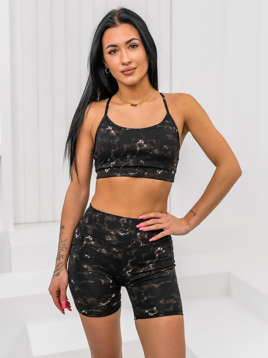 Fekete színű, kétrészes, női tréning szett - Bolf XL015 -, amely egy sportmelltartót és egy rövidnadrágot tartalmaz. A rövidnadrág állítható derékban erős szűkítővel, két oldalsó, nem zárható zsebe van. A melltartó betétekkel és alul passzéval rendelkezik, ennek köszönhetően tökéletesen idomul a női alakhoz. Finom, kellemes tapintású anyagból készült termék. A szett nagyszerűen mutat pulcsival, sportdzsekivel vagy mellénnyel. Pompásan mutat, egy nélkülözhetetlen sportos outfit lehet!