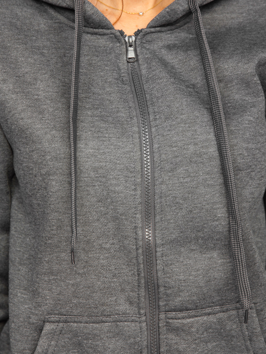 Grafit színű, kétrészes, női melegítő szett -Bolf 0003- egyedi ajánlat minden sportos stílust kedvelőnek. A szett egy pulcsit és egy nadrágot tartalmaz. Cipzározható pulcsi, állítható kapucnival és két zsebbel rendelkezik. A melegítőnadrág állítható derékban erős megkötővel és szűkítővel. Két zsebe van elöl, a szár passzés, ennek köszönhetően jól idomul az alakhoz. Sportos jelleget az egyenes, testhezálló fazon biztosít. Finom, kellemes tapintású anyagból készült termék. A tréningruha szett önmagában ideális, sportos viseletet alkot, amely nem csak edzésen, hanem egy laza otthoni napon, vagy egy hegyi kiránduláson is tökéletes. Párosíthatod könnyű átmeneti dzsekivel, sportdzsekivel vagy mellénnyel.
