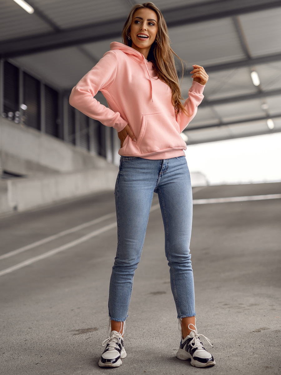 Univerzális, női kapucnis pulcsi rózsaszín színben. Minimalista fazon, ideális különböző stilizációkhoz. Világosrózsaszín női pulcsi, puha anyagból varrott. Szépen fekszik. A pulcsit viseld sportosan. Sneakerrel, farmerral és baseball sapkával. Vagy keverd a stílusokat. Párosítsd félcsizmával, stílusos kabáttal.