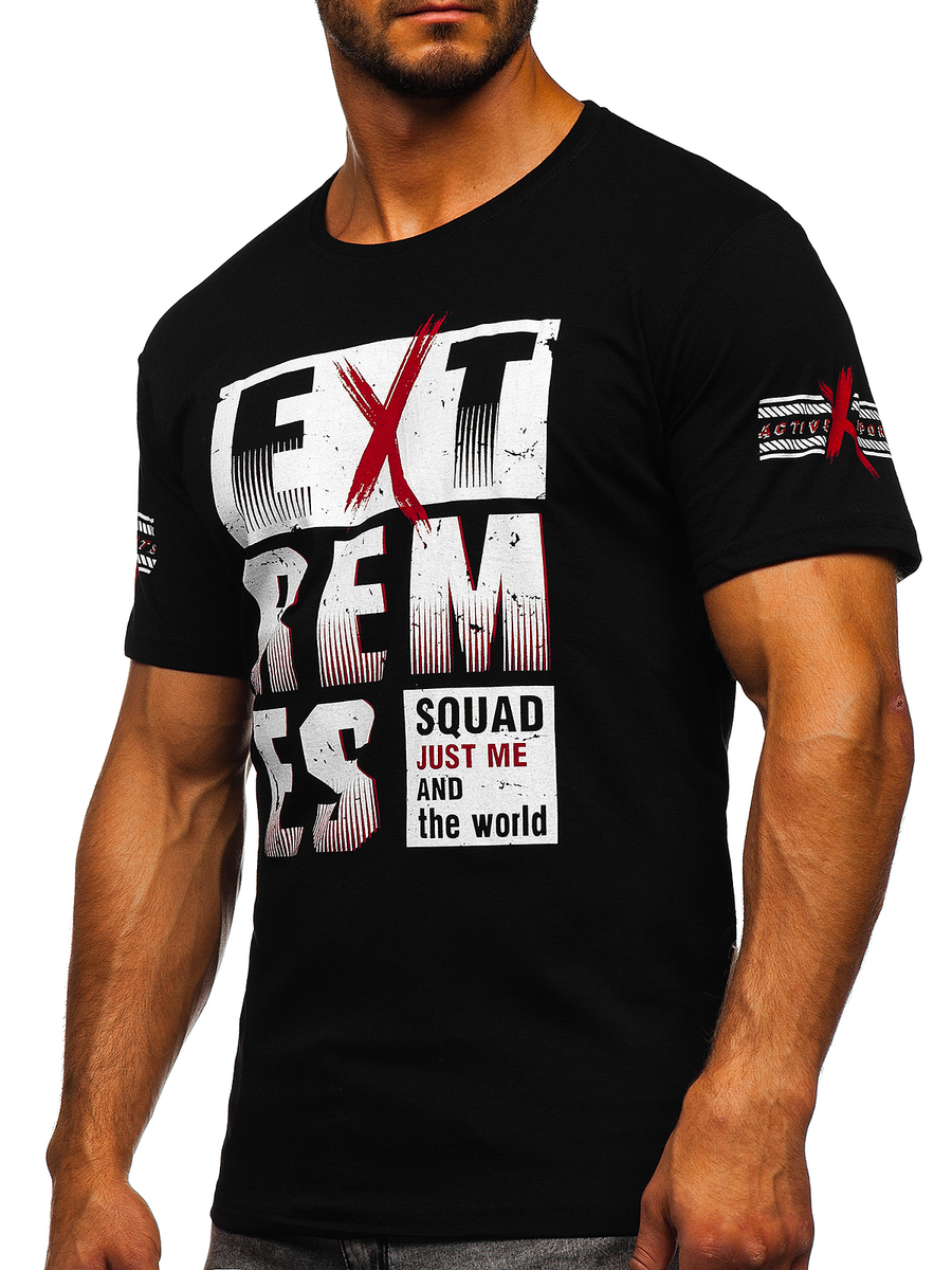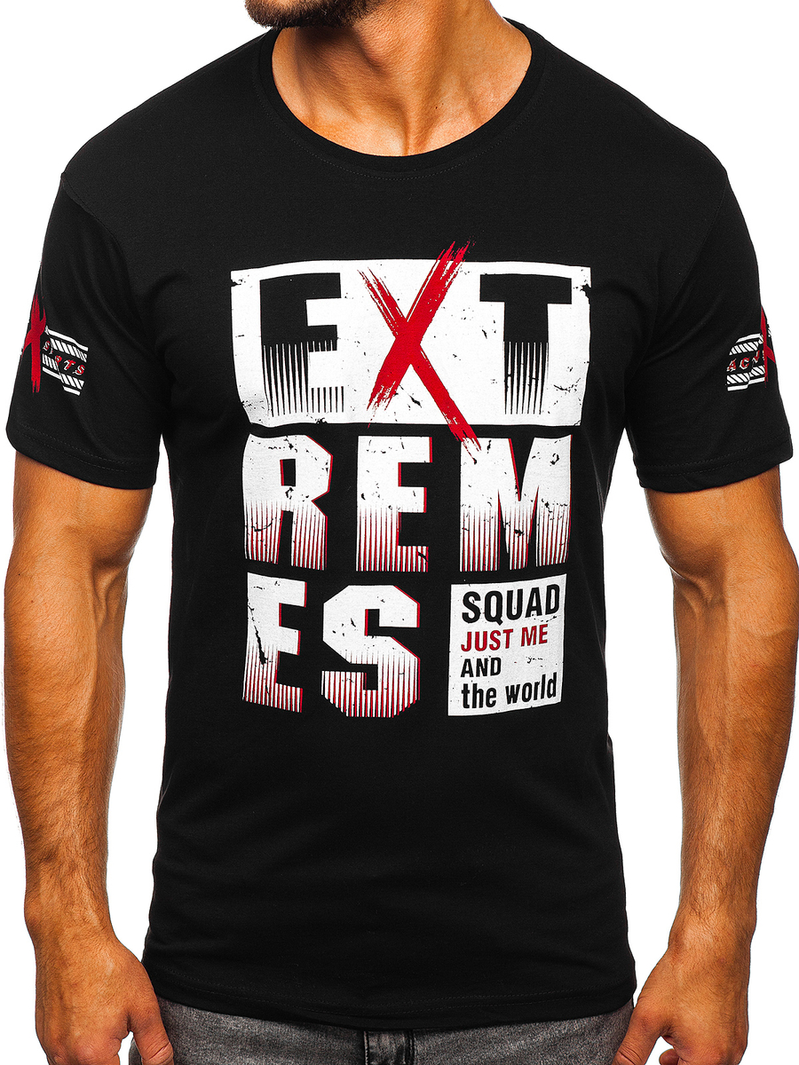 Fekete színű férfi póló nyomattal -Bolf 14312- férfi stilizáció univerzális eleme, kifejezetten divatos kiadásban. Egyenes szabású és kerek dekoltázsú póló, jól idomul minden alakhoz. Egyedi nyomatának köszönhetően a póló jellegzetessé teszi minden stilizációt. 100% pamutból készült. Az univerzalitásnak köszönhetően számos divatos stilizációt alakíthatsz ki vele. Sportos és hétköznapi outfitekben is megállja a helyét. Melegítőnadrággal és mellénnyel divatos, sportos kinézetet biztosít.