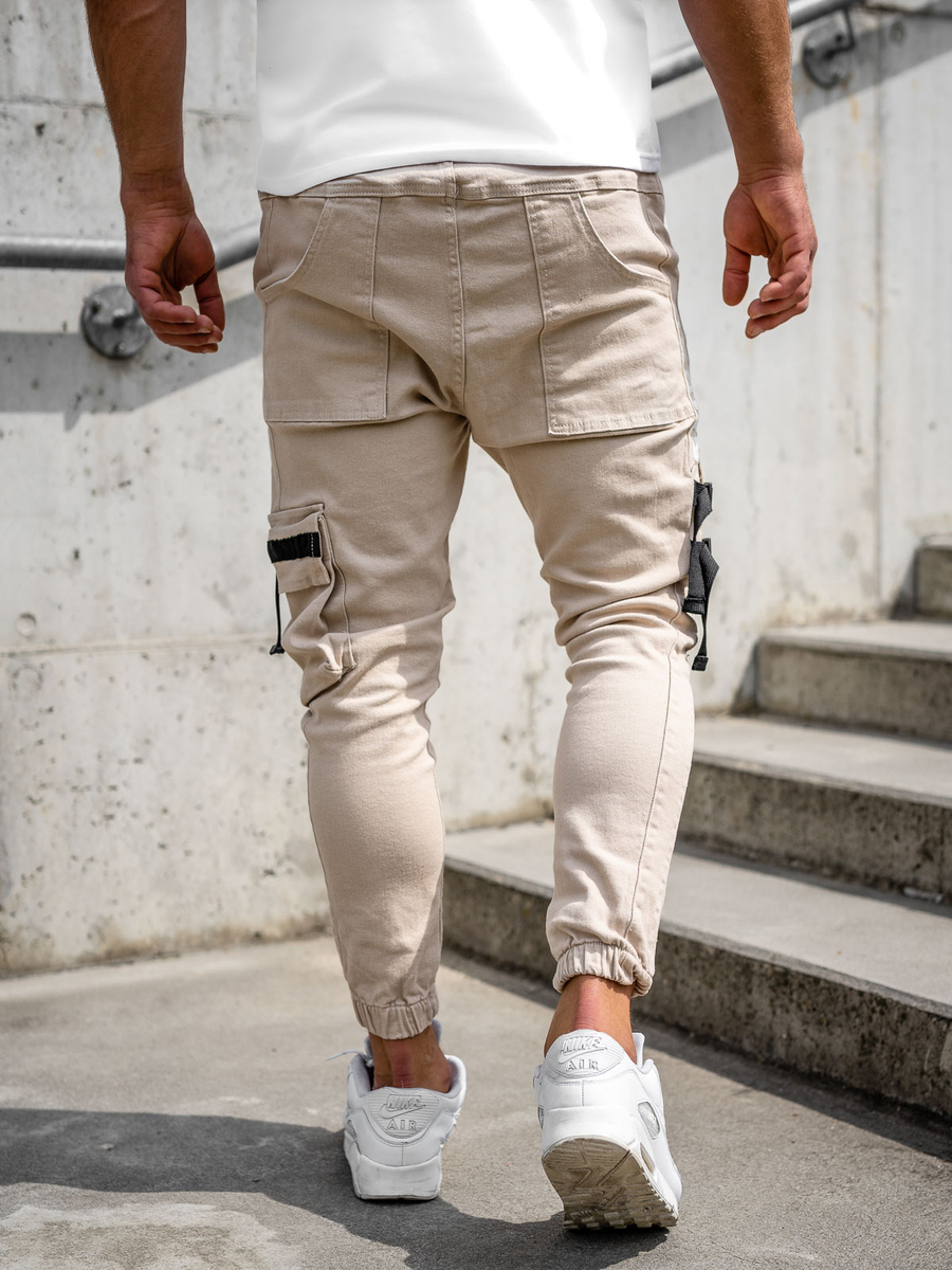 Bézs színű, katonai férfi jogger nadrág - Bolf 6685 - azoknak ajánljuk, akik értékelik a kényelmet és a mega divatos kinézetet. Állítható derékban erős szűkítővel és megkötővel, nagyszerűen alakra szabott. Két külső, zár nélküli zsebbel és két oldalsó, zsebfedős zsebbel rendelkezik. Hátul két zár nélküli zseb található. Ennyi zsebnek köszönhetően mindig nálad lesz minden, amire szükséged lehet! A lábszárak passzéval vannak ellátva, ennek köszönhetően nemcsak esztétikus megjelenésű a nadrág, hanem véd a hidegtől és a széltől is. Ez a modell dekoratív zárral van ellátva az oldalsó zseben, amely tetszeni fog a különleges stilizációt kedvelőknek. Jogger, jól mutat nyári stilizációkban pólóval, télen pedig melegebb dzsekivel.