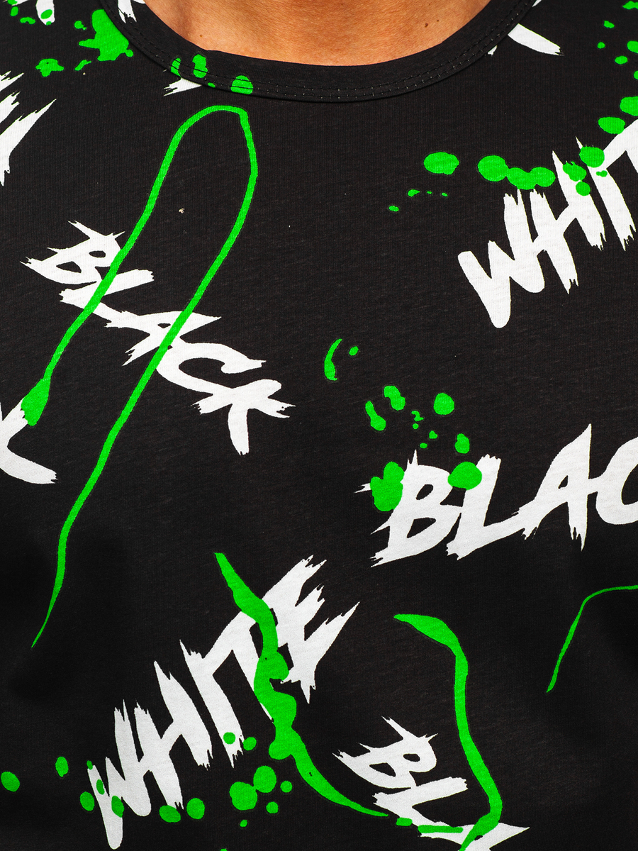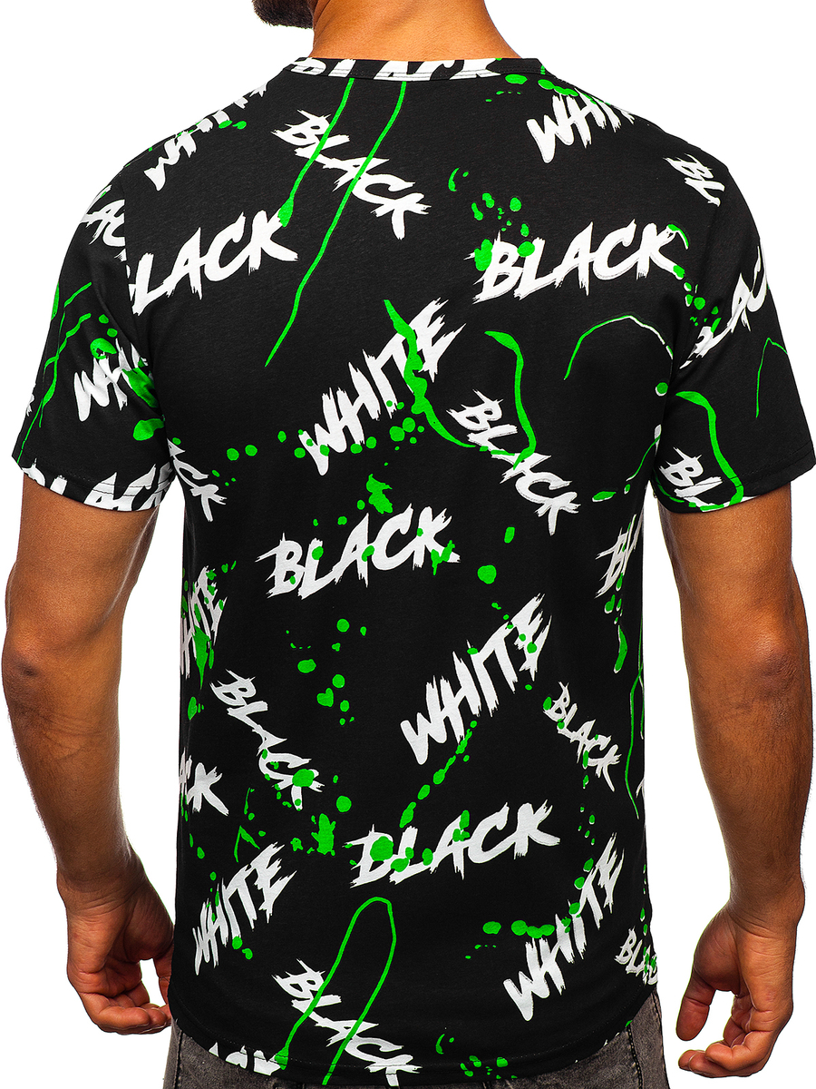 Fekete-zöld, mintás férfi póló - Bolf 14939- három féle színben kapható. A dizájnos nyomatnak köszönhetően a póló egy must have ajánlat lehet, amely egyedi jelleget biztosít minden stilizációnak. Univerzális kerek dekoltázzsal. A legmagasabb minőségű anyagnak köszönhetően (100% pamut), kényelmet biztosít minden helyzetben. Nagyszerűen mutat hétköznapi stilizációkban vagy edzés közben. Remekül mutat párban bármilyen típusú nadrággal, például melegítőnadrággal vagy farmernadrággal. Sportos outfitekhez ajánlott, nagyszerűen mutat párban pulcsival vagy mellénnyel.