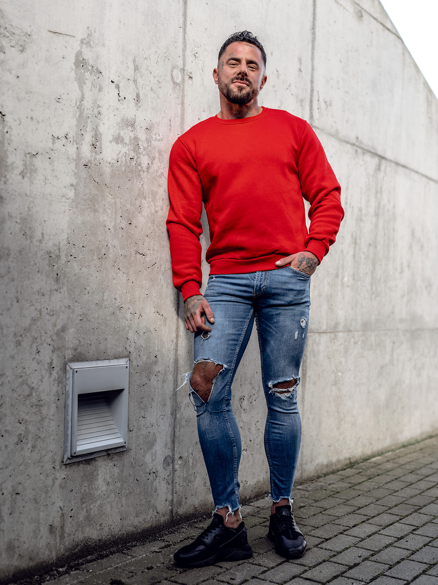 Piros színű, kapucni nélküli férfi pulcsi -Bolf 2001A-, basic kategóriás ajánlatunk. Ez a modell számos, többé-kevésbé intenzív színben is kapható, így számtalan ruhával könnyen összeilleszthető. A pulcsikat kifejezetten a minimalista divatirányzatok rajongóinak számára ajánljuk. Minta nélküli, kényelmes, szépen varrott. Must have a férfi divatos ruhásszekrényében. Az egyszerű, klasszikus, érdekes színű fazonjának köszönhetően ez a pulcsimodell nagyszerűen kiegészít számos hétköznapi és streetes stilizációt. Az ujjak és a pulcsi alsó része széles passzéval ellátva. A termék kellemes tapintású és tartós melegítőanyagból készült.