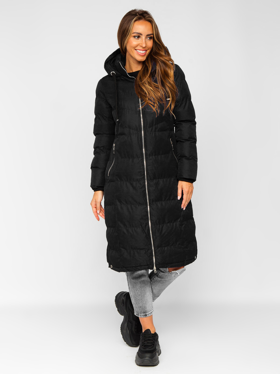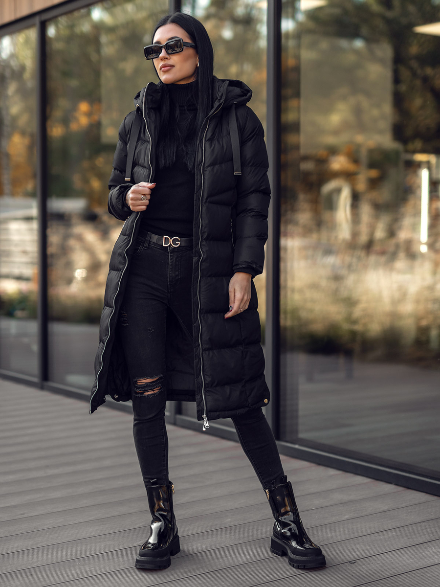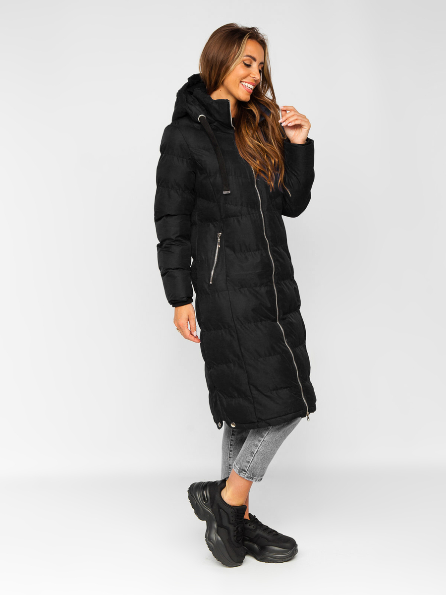 A felhasználók véleménye Hosszú steppelt téli női dzseki kapucnival fekete színben Bolf 5M736