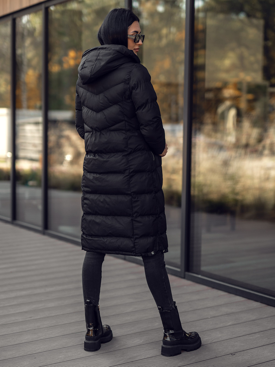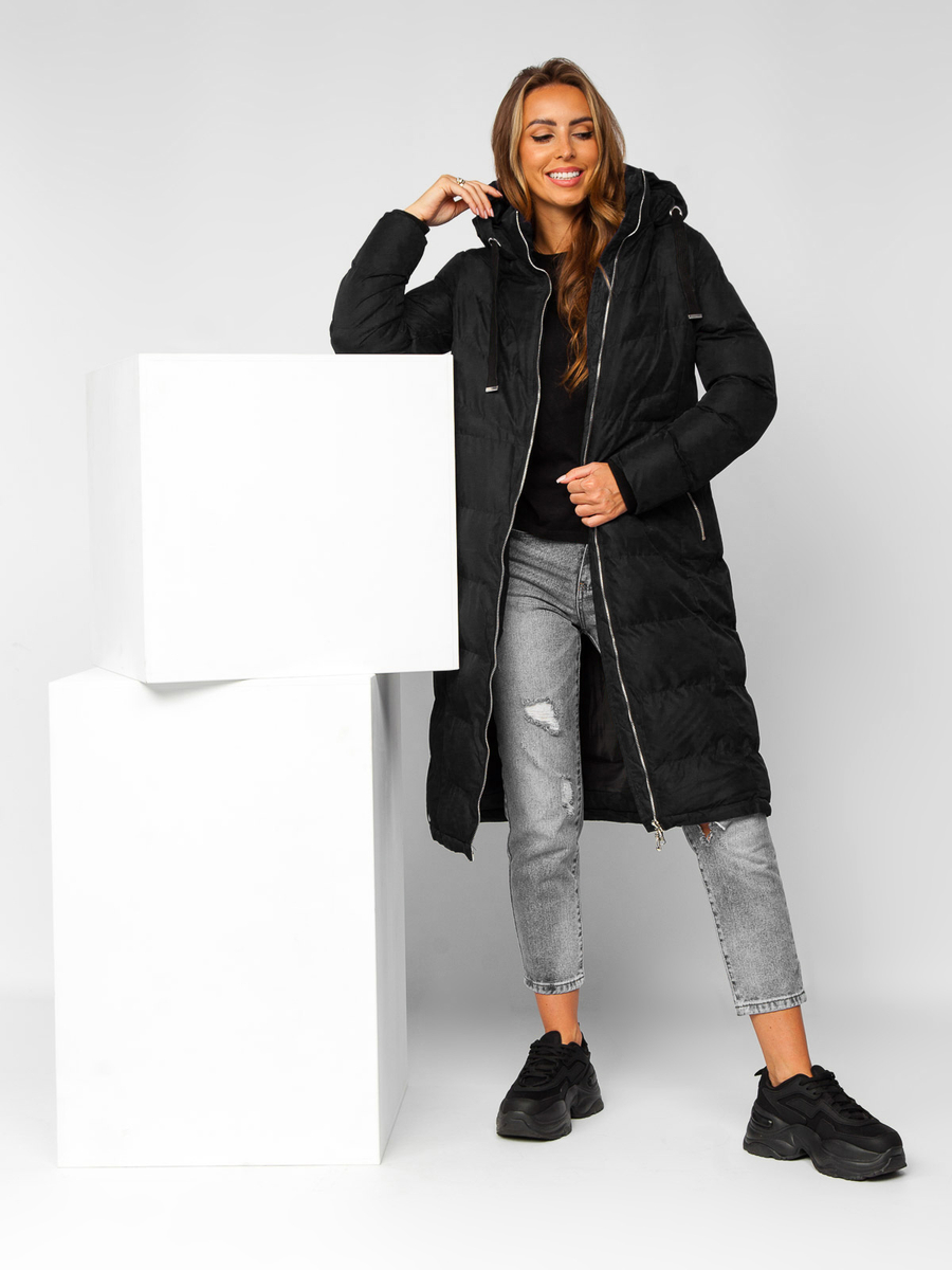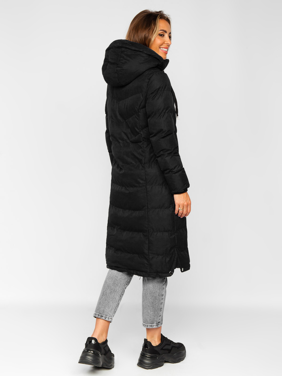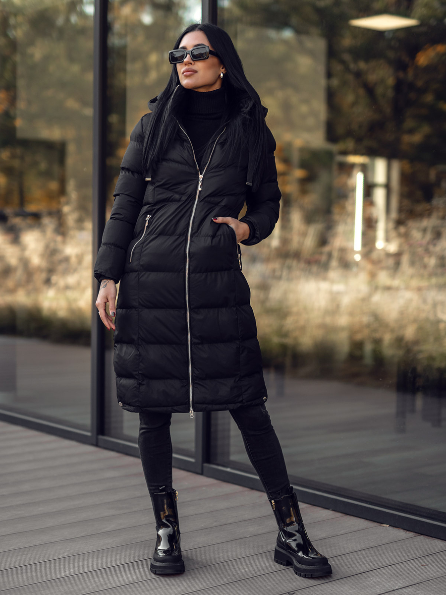 A felhasználók véleménye Hosszú steppelt téli női dzseki kapucnival fekete színben Bolf 5M736