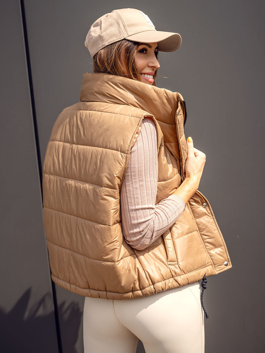 A barna, rövid steppelt női mellény Bolf 82032 tökéletes választás az átmeneti időszakra, amikor még túl meleg van kabátra, de már túl hűvös kabát nélkül kimenni. Ilyenkor ideális megoldás a rövid, steppelt mellény. Ha egy univerzális, sokféle stílushoz illeszkedő modellt keresel, ez a mellény lesz a legjobb választás. Egyszerű, oversized szabással rendelkezik, praktikus állógallérral, cipzárral és patentokkal záródik. Két külső zsebe van, az alján pedig egy összehúzható szegély található, amely extra védelmet nyújt a hideg és a szél ellen. Ez a steppelt mellény leginkább sportos és casual stílusú összeállításokhoz illik, de megfelelő elemekkel kombinálva urban stílusú outfitekhez is hordható. Viseld pulóverrel vagy garbóval, és párosítsd kényelmes farmerrel vagy leggingszel, hogy élvezhesd a kényelmes hétköznapi megjelenést.