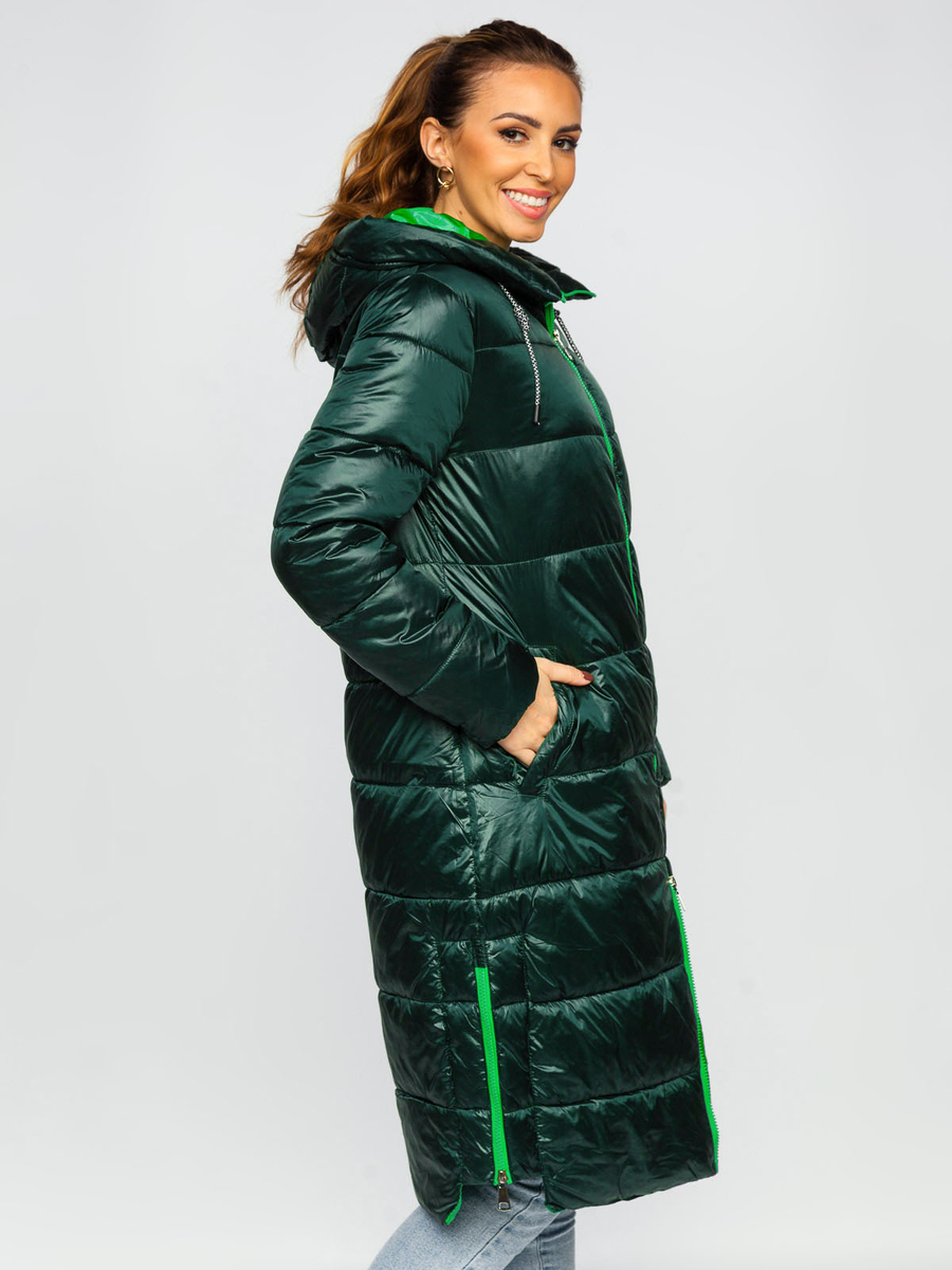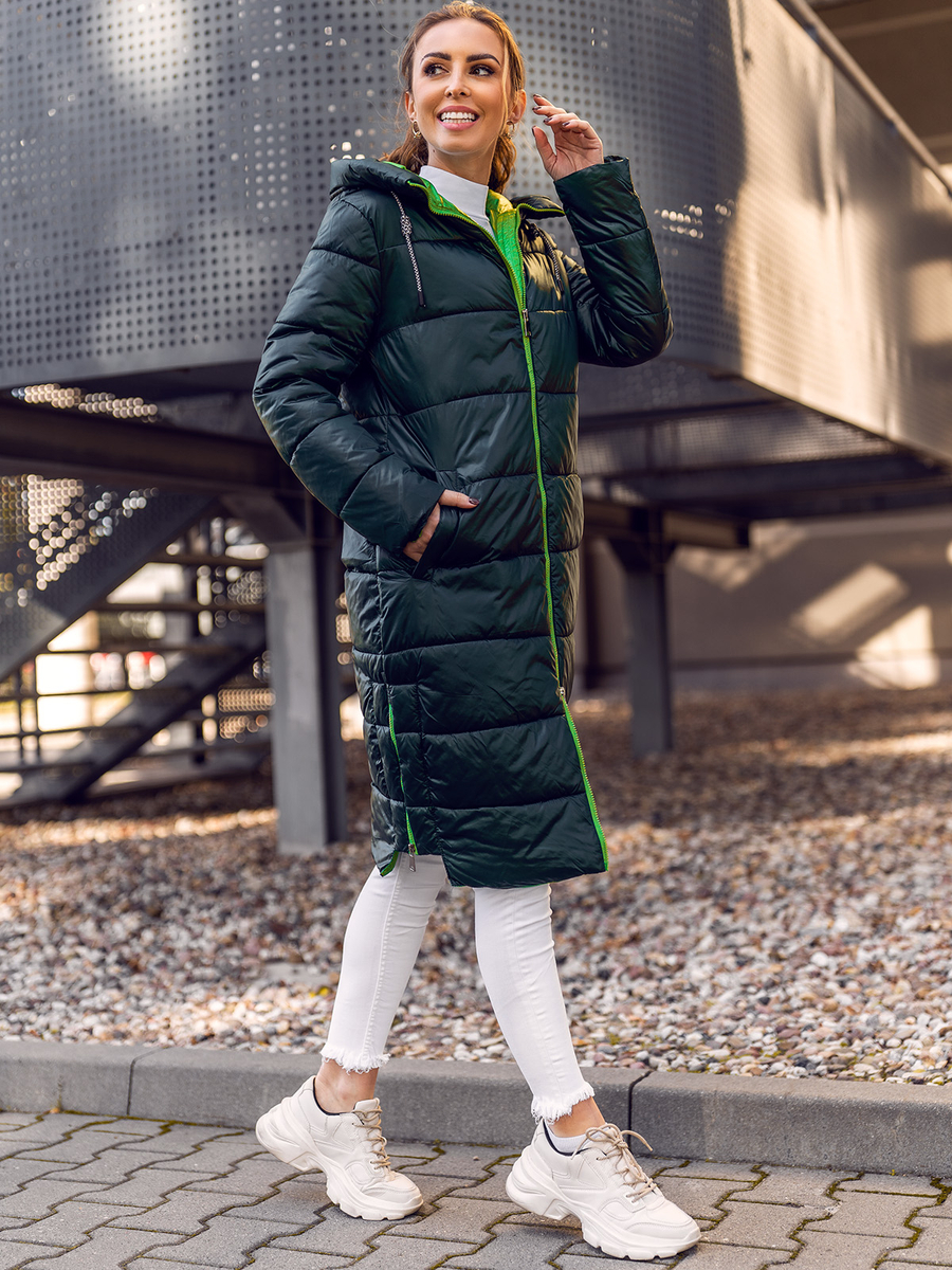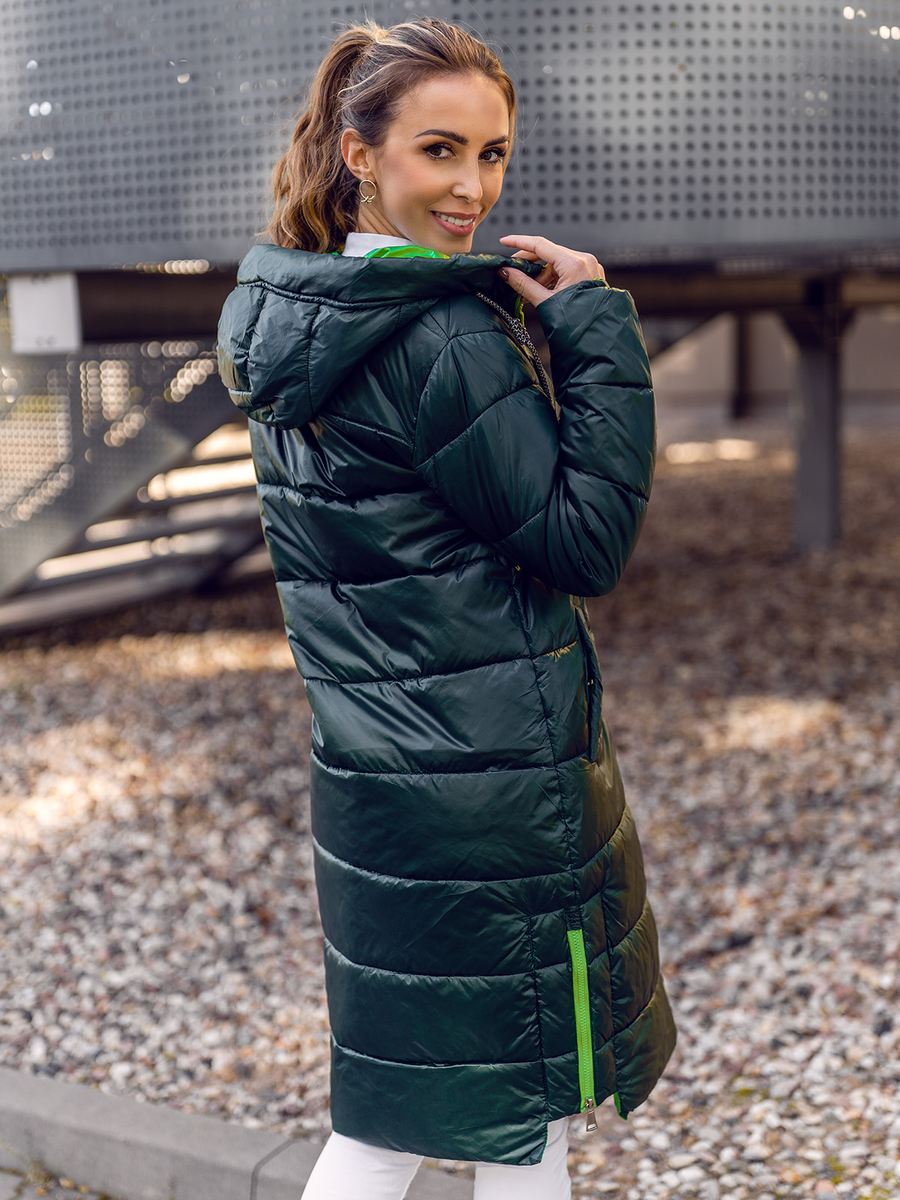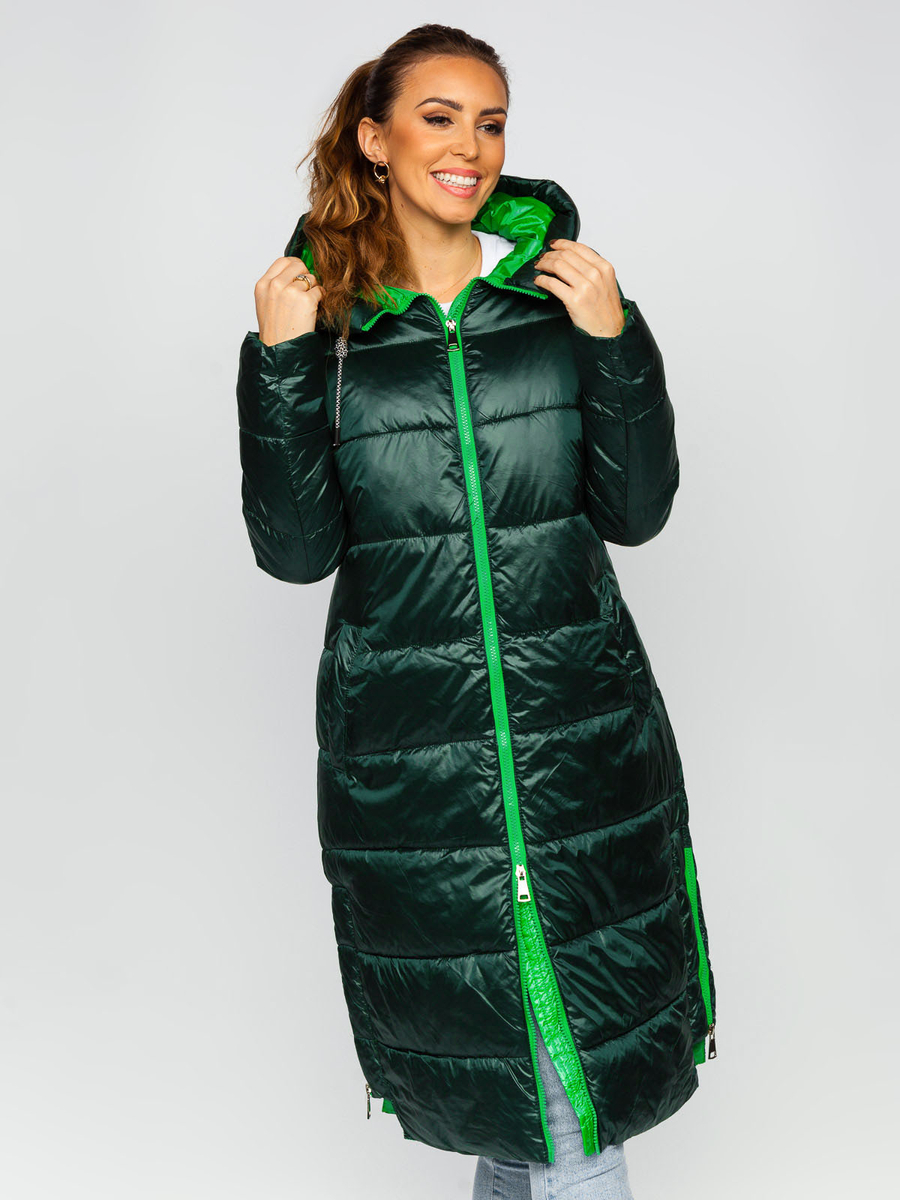 A felhasználók véleménye Zöld hosszú steppelt női kabát kapucnival Bolf J9063