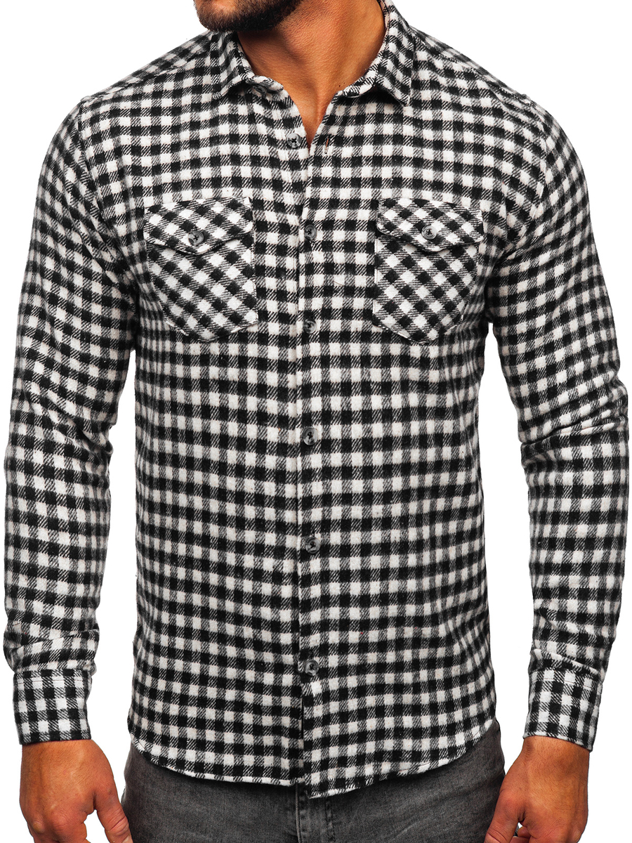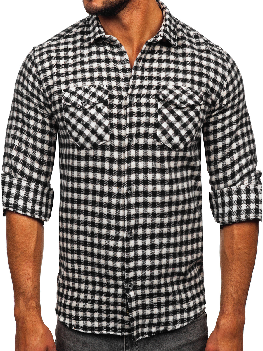 A felhasználók véleménye Hosszú ujjú kockás férfi flaneling fekete-fehér színben Bolf 22701