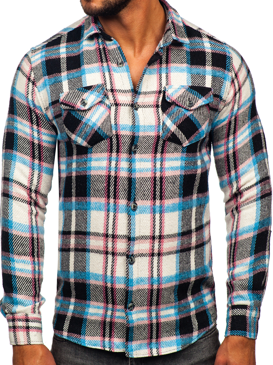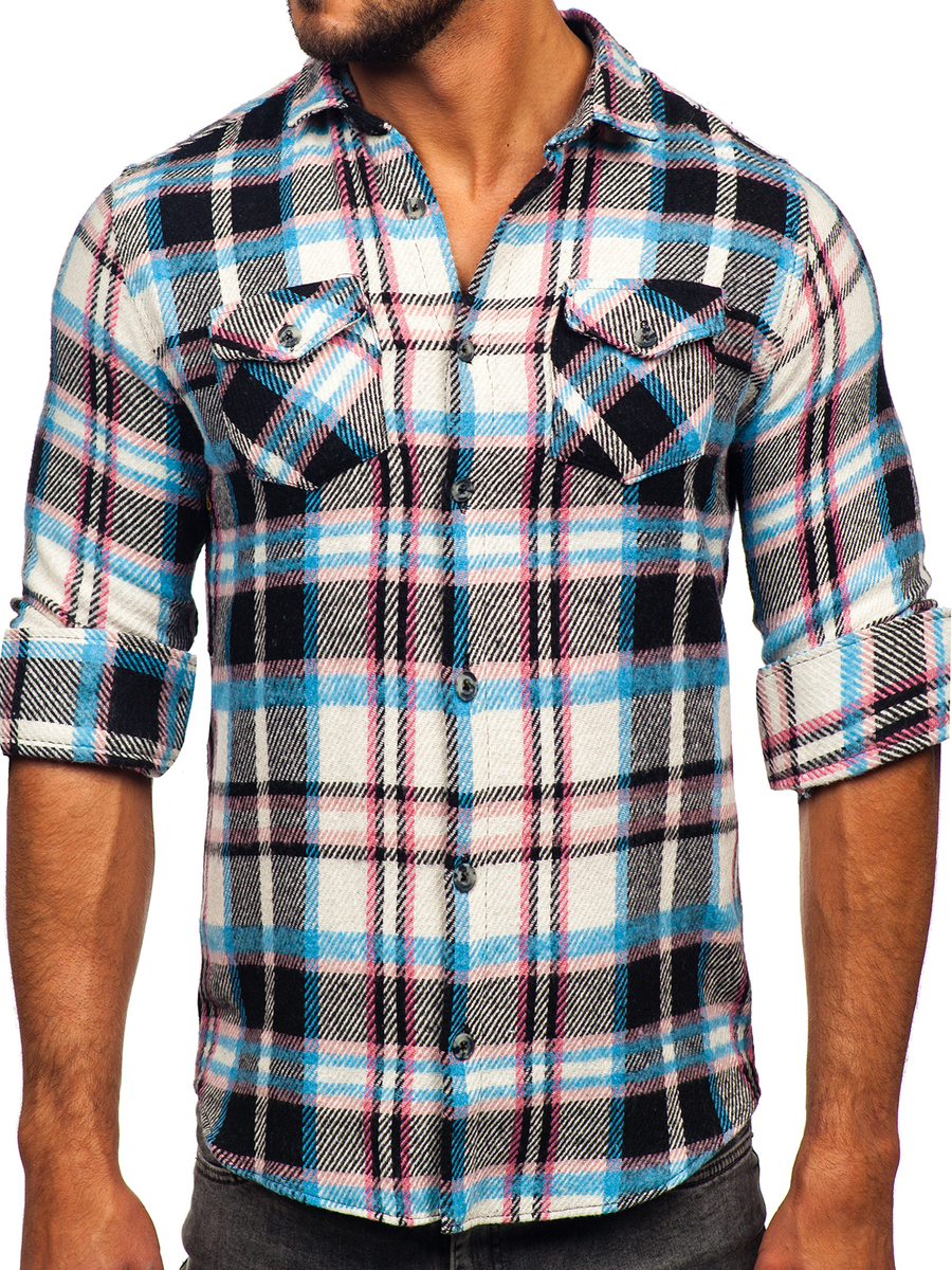 A felhasználók véleménye Hosszú ujjú kockás férfi flaneling kék-rózsaszín színben Bolf 22704