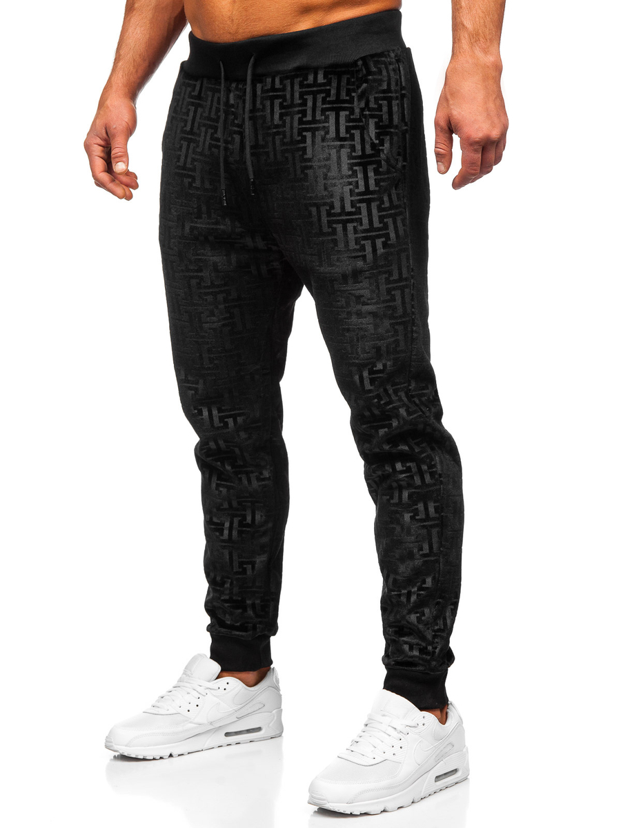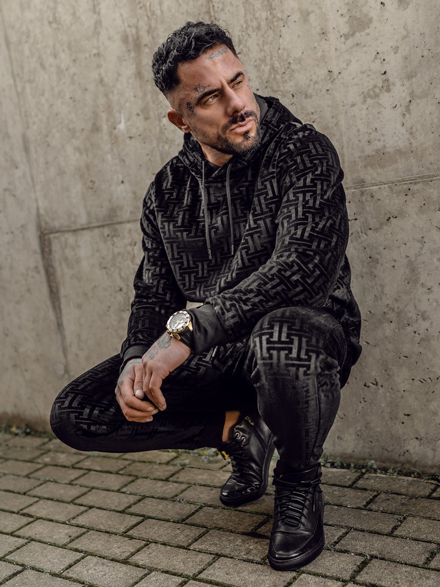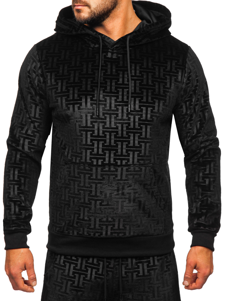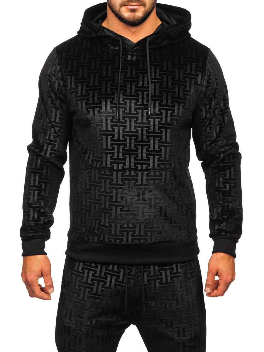 Fekete színű velúr férfi tréningruha kapucnival - Bolf 3A81- mega divatos sportos tréningszett. A szett egy pulcsit és egy nadrágot tartalmaz. A pulcsi állítható kapucnival és kenguruzsebbel rendelkezik. A nadrág állítható derékban erős megkötővel és szűkítővel és külső zsebekkel rendelkezik. Sportos jelleget az egyenes, testhezálló fazon biztosít. Finom, kellemes tapintású anyagból készült termék. Velúr tréningruha, különleges ajánlat a hétköznapi és a sportos stilizációkhoz. A melegítőfelső és a nadrág jól párosítható különböző ruhadarabokkal, ami széles lehetőségeket kínál a mindennapi stilizációk létrehozásához. A szett nagyszerűen mutat pólóval és mellénnyel!
