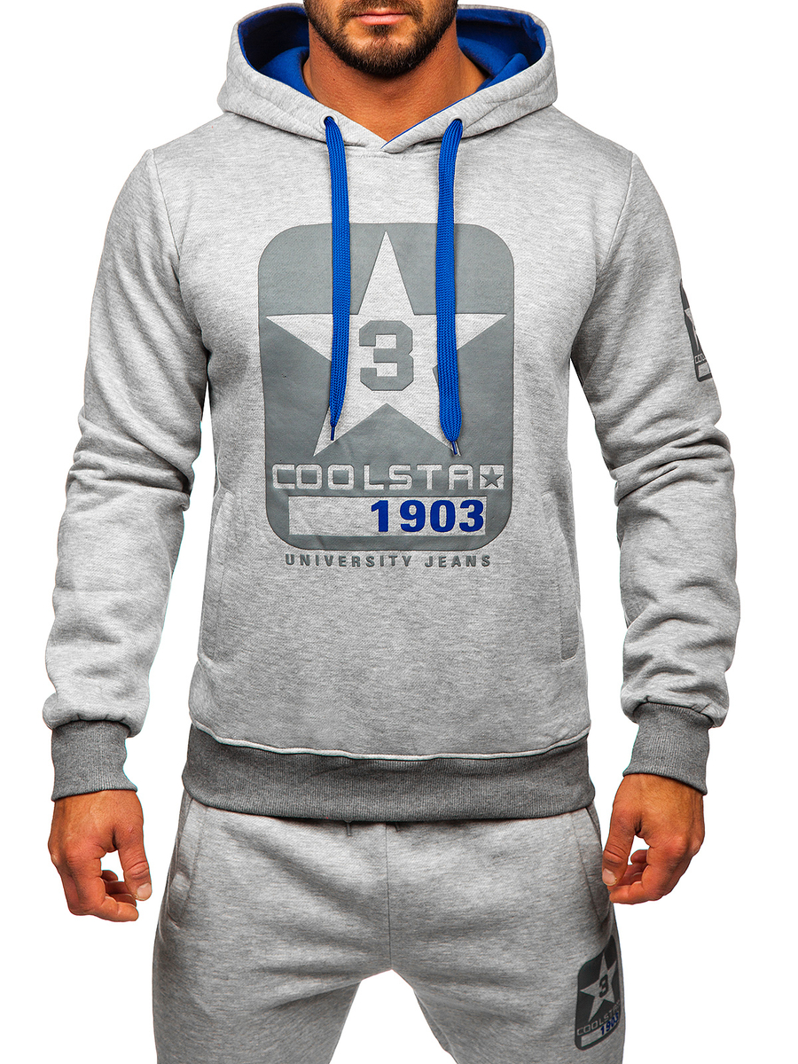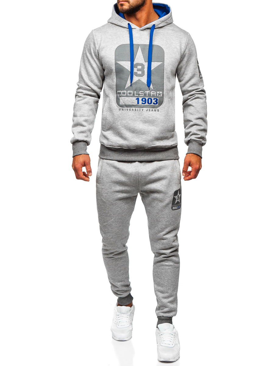 Szürke színű, férfi tréningruha kapucnival - Bolf 8C59 - egy sportos tréningszett, amely egy kapucnis melegítőfelsőt és egy szabadidőnadrágot tartalmaz. Melegítőfelső két külső zsebbel, a kapucni, az alja és az ujjak passzésak. A nadrág állítható derékban erős megkötővel és szűkítővel és két zsebe van. Sportos jelleget az egyenes, testhezálló fazon biztosít. Finom, kellemes tapintású anyagból készült termék. A pulcsi és a nadrág jól párosítható különböző ruhadarabokkal, ami széles lehetőségeket kínál a mindennapi stilizációk létrehozásához. A szett nagyszerűen mutat pólóval, mellénnyel vagy sportdzsekivel. A melegítő szett különféle helyzetekben is megállja a helyét, akár otthon, séta közben vagy bevásárláskor, valamint az edzőteremben vagy a szabadban végzett edzéseken is beválik.