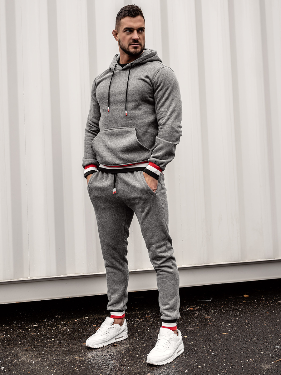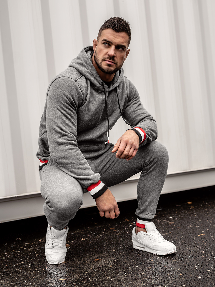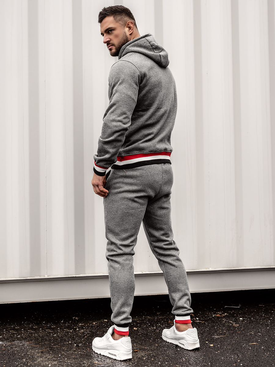 Grafit színű, férfi tréningruha kapucnival - Bolf 8C60 - egy sportos tréningszett, amely egy kapucnis melegítőfelsőt és egy szabadidőnadrágot tartalmaz. Melegítőfelső kenguru zsebbel, az állítható kapucni, az alja és az ujjak passzésak. A nadrág állítható derékban erős megkötővel és szűkítővel és két zsebe van. Sportos jelleget az egyenes, testhezálló fazon biztosít. Finom, kellemes tapintású anyagból készült termék. A pulcsi és a nadrág jól párosítható különböző ruhadarabokkal, ami széles lehetőségeket kínál a mindennapi stilizációk létrehozásához. A szett nagyszerűen mutat pólóval, mellénnyel vagy sportdzsekivel. A melegítő szett különféle helyzetekben is megállja a helyét, akár otthon, séta közben vagy bevásárláskor, valamint az edzőteremben vagy a szabadban végzett edzéseken is beválik.