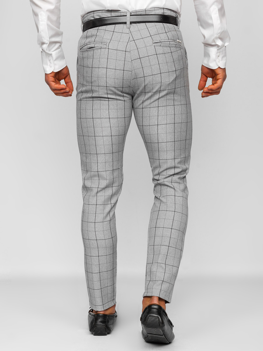 Szürke-fekete férfi kockás chino nadrág Bolf 0032, ideális mindazok számára, akik az elegáns stílust kedvelik. Nadrág, klasszikus hosszú szárral, cipzárral és gombokkal. Ez a modell praktikus zsebekkel rendelkezik, könnyedén beleférnek a különféle fontos tárgyaid, dokumentumaid. Kettő hátul található és kettő elől. A legmagasabb minőségű anyagokból készül, ami rendkívül puha és kellemes tapintást biztosít. A chino időtálló, kényelmes, praktikus és mindig jól mutat. Viseld együtt bőrdzsekivel és pólóval, amivel minden alkalmohoz illő stilizációkat kapsz.