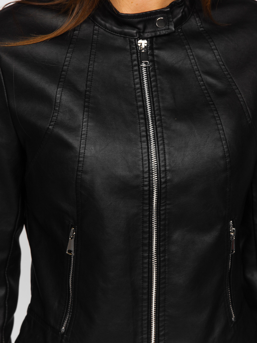 Fekete színű női bőrdzseki -Bolf 11Z8033- egy klasszikus ruhadarab minden nő számára, aki nem csak stílust hanem a kényelmet és a minőséget is értékeli. A termék cipzáros, álló típusú a gallér és egyenes az alsó rész. A legmagasabb minőségű anyagból készült, ennek köszönhetően különleges a megjelenése, strapabíró az anyaga és nagyon kényelmes. A dzseki nagyszerűen passzol számos hétköznapi, casual stilizációhoz farmerral és pólóval, vagy elegánsabb szettekben egy egyrészes ruhához vagy szoknyához.