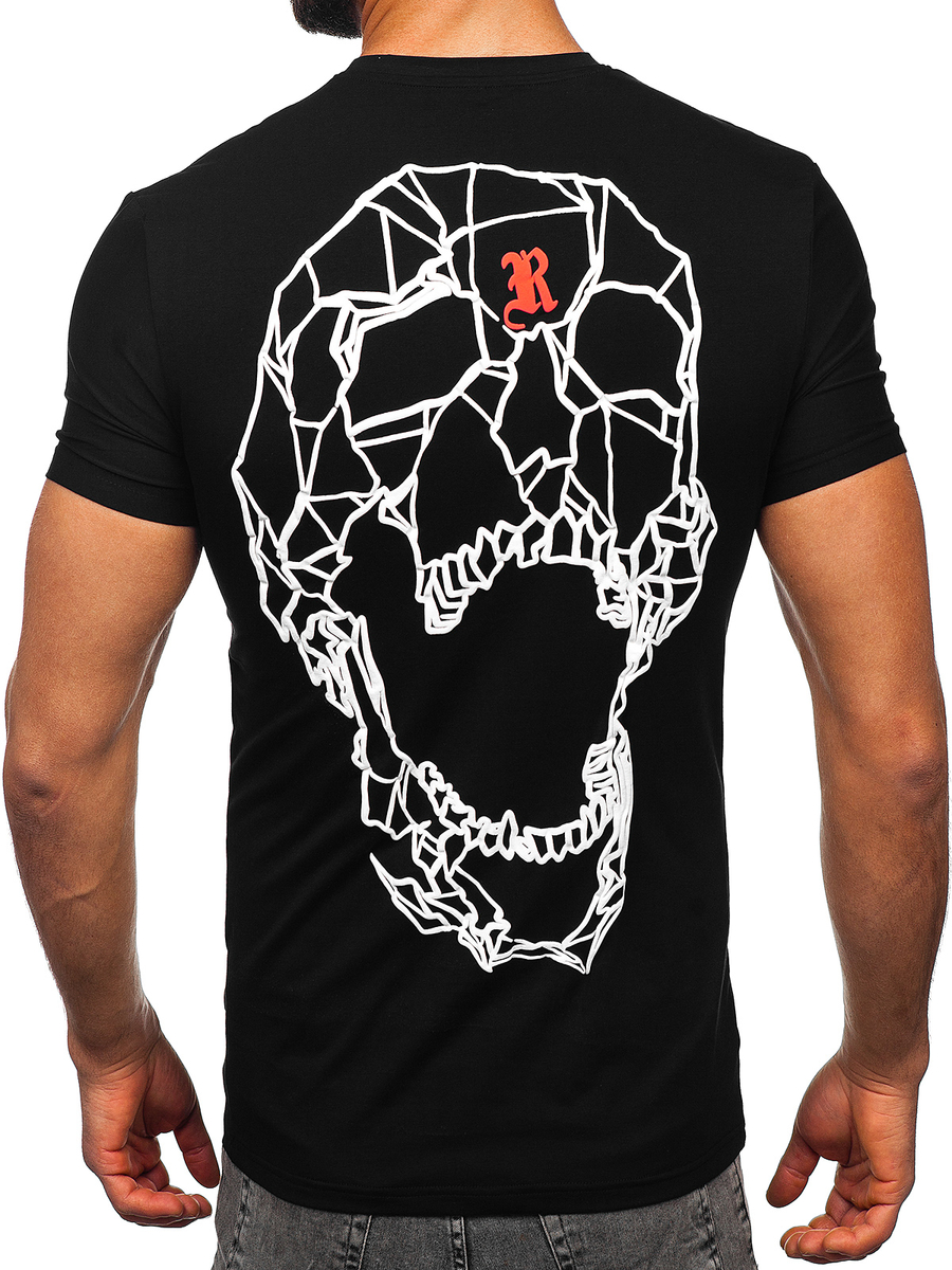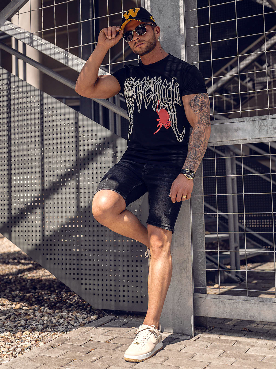 Fekete színű férfi póló nyomattal -Bolf MT3026- nagyszerű ajánlat azoknak, akik szeretik az egyedi, különleges mintákat. Jól párosítható melegítőfelsővel és melegítőnadrággal. Ideális a hétköznapokra és az edzésekre. 95%-ban pamutból és 5% elasztánbóll készült, ennek köszönhetően rugalmas, puha és tartós az anyaga. A kerek dekoltázs és a slim fit fazon jól idomul és kiemeli az alakot. A póló fehér és fekete színben elérhető.