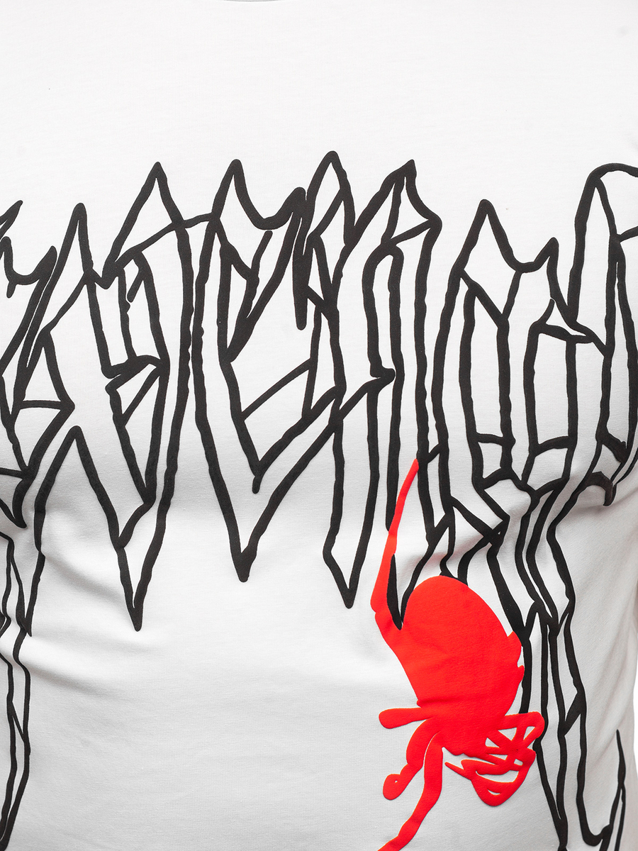 Fehér színű férfi póló nyomattal -Bolf MT3026- nagyszerű ajánlat azoknak, akik szeretik az egyedi, különleges mintákat. Jól párosítható melegítőfelsővel és melegítőnadrággal. Ideális a hétköznapokra és az edzésekre. 95%-ban pamutból és 5% elasztánbóll készült, ennek köszönhetően rugalmas, puha és tartós az anyaga. A kerek dekoltázs és a slim fit fazon jól idomul és kiemeli az alakot. A póló fehér és fekete színben elérhető.
