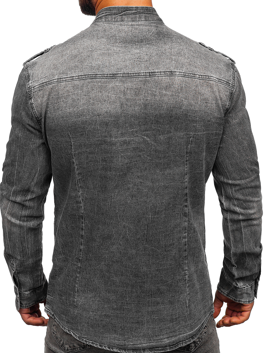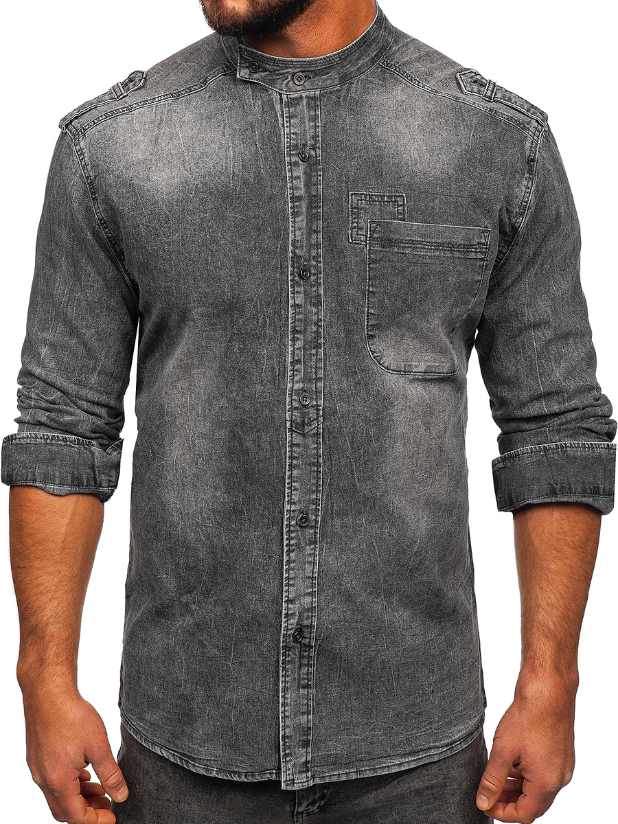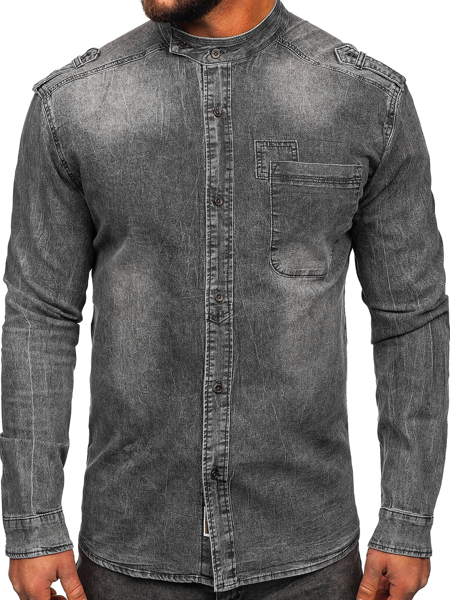 Grafit színű, hosszú ujjú, férfi farmer ing -Bolf MC713G- minden férfi ruhásszekrényének kötelező darabja. Fantasztikusan mutat motoros dzsekivel és farmerral. Gombolható, állógallérral, állítható mandzsettával. Pamut és elasztán keverékéből készült, ennek köszönhetően megfelelően rugalmas és finom az anyaga. Koptatott hatással a teljes felületen, mely divatos, fiatalos jelleget biztosít. Nagyszerűen mutat hétköznapokon, az ismerősökkel való találkozások alkalmával, vagy randin.