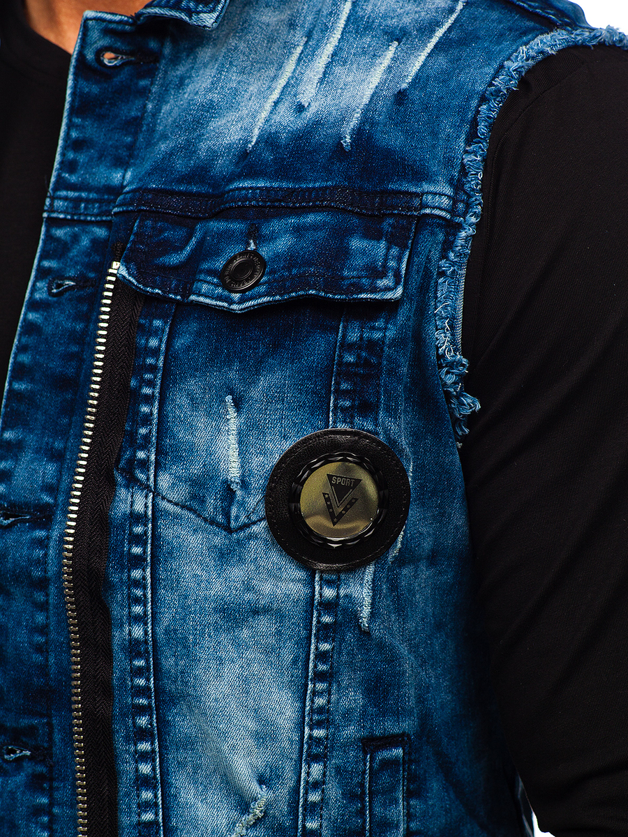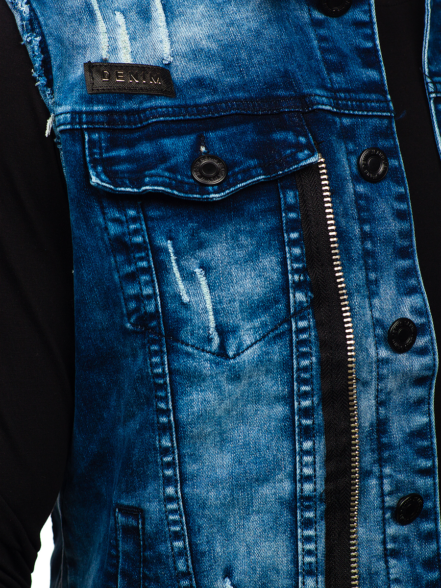 Gránátkék színű férfi farmermellény -Bolf G115- azoknak a férfiaknak ajánljuk, akik a kifejező, erős lookot kedvelik. Magas minőségű denimből készült, ennek köszönhetően rugalmas, kényelmes és tartós. A koptatás, a koptatott hatás és a számos varrások a dzsekin egy divatos, kis rockos hangulatot biztosítanak. Számos tágas zsebekkel rendelkezik, amelyekben könnyedén elfér telefon, pénztárca vagy dokumentumok. Érdemes fekete farmerral és hosszú ujjú felsővel párosítani.