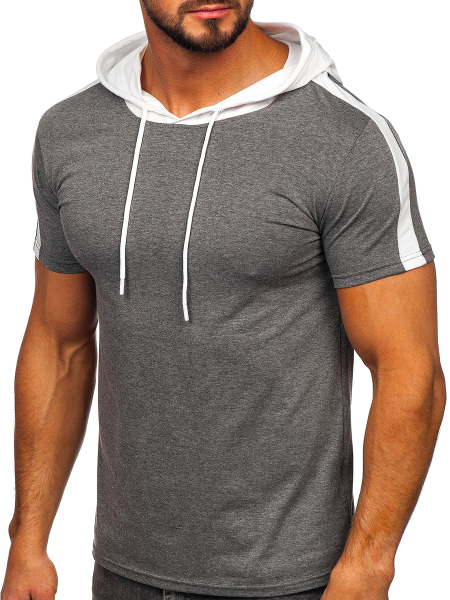 Szürke színű férfi póló - Bolf 8T299- nagyszerűen passzol hétköznapi és sportos stilizációkhoz. A rugalmas anyagnak és a slim fit szabásnak köszönhetően fantasztikusan kiemeli az alakot és nem akadályoz a mozgásban. Rendkívül kellemes tapintású az anyaga, kényelmet biztosít viselés közben. Póló állítható kapucnival, mely tökéletesen véd a szél és a hideg elől. Nagyszerűen mutat párban joggerrel és sportdzsekivel. Néhány féle színben kapható.