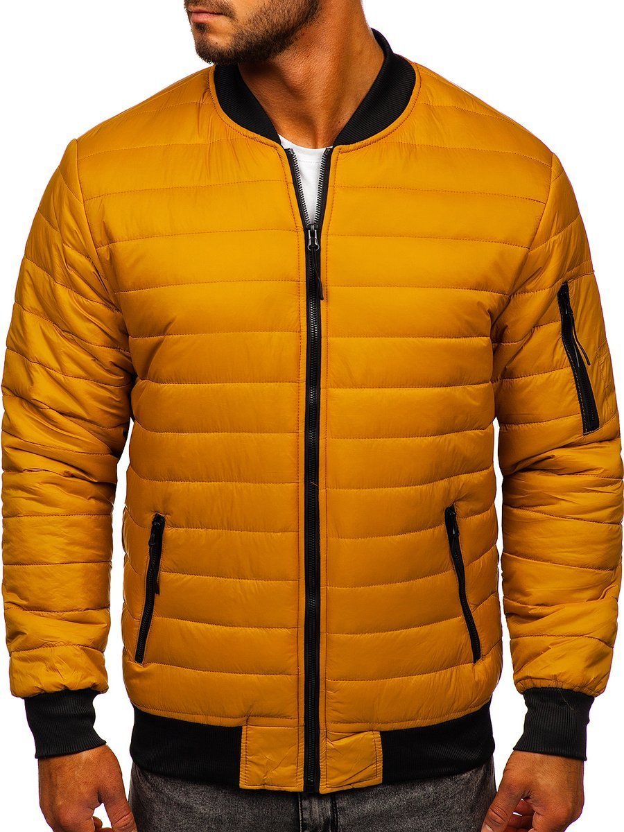 Camel színű, átmeneti férfi bomberdzseki -Bolf MY-02A- vízszintes steppeléssel. Cipzározható. A bomber jacket típusú dzseki jól mutat sportos és hétköznapi stilizációkban, nagyszerű kiegészítése a streetes outfitteknek is. Praktikus állógallérral rendelkezik. Két külső cipzáros zsebbel és egy extra cipzározható zsebbel a bal ujjon. Az ujjak, az alja és a gallér kontrasztos fekete színű passzéval ellátva. A dzseki az egyszerűségének és a kivitelezés minőségének köszönhetően időtálló és több évszakban is viselhető. Tökéletesen illeszkedik a modern trendekhez, könnyű, kellemes tapintású, könnyű és meleg anyagból készült. A sportos stílusú dzseki a hűvösebb napokon, kora tavasszal és ősszel is megállja a helyét. A széles színválasztéknak köszönhetően számos stilizációt alakíthatsz ki vele.