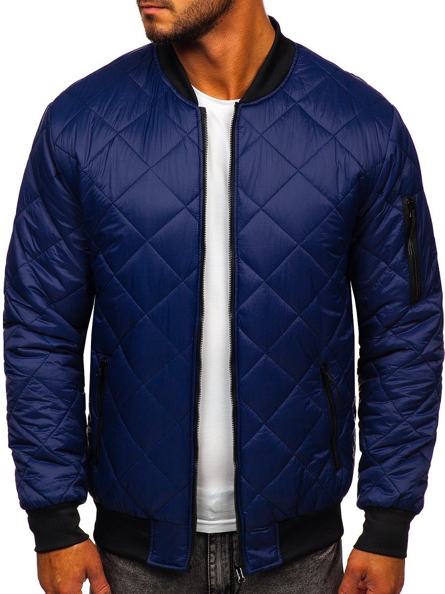 Gránátkék színű, steppelt, átmeneti férfi bomberdzseki, Bolf MY-01A, a bomberdzseki klasszikus darabja. A dzseki az egyszerűségének és a kivitelezés minőségének köszönhetően időtálló és több évszakban is viselhető. A bomberdzseki nagyszerűen illeszkedik a legújabb trendekhez, kellemes tapintású anyagból készült. Rombusz alakú steppeléssel. Állógallérral rendelkezik, mely cipzározható. Az ujjak, a gallér és a dzseki alsó része széles, fekete szűkítőkkel van ellátva. Bomber, két praktikus, külső cipzáras zsebbel rendelkezik. További zárható zsebbel a bal ujjon