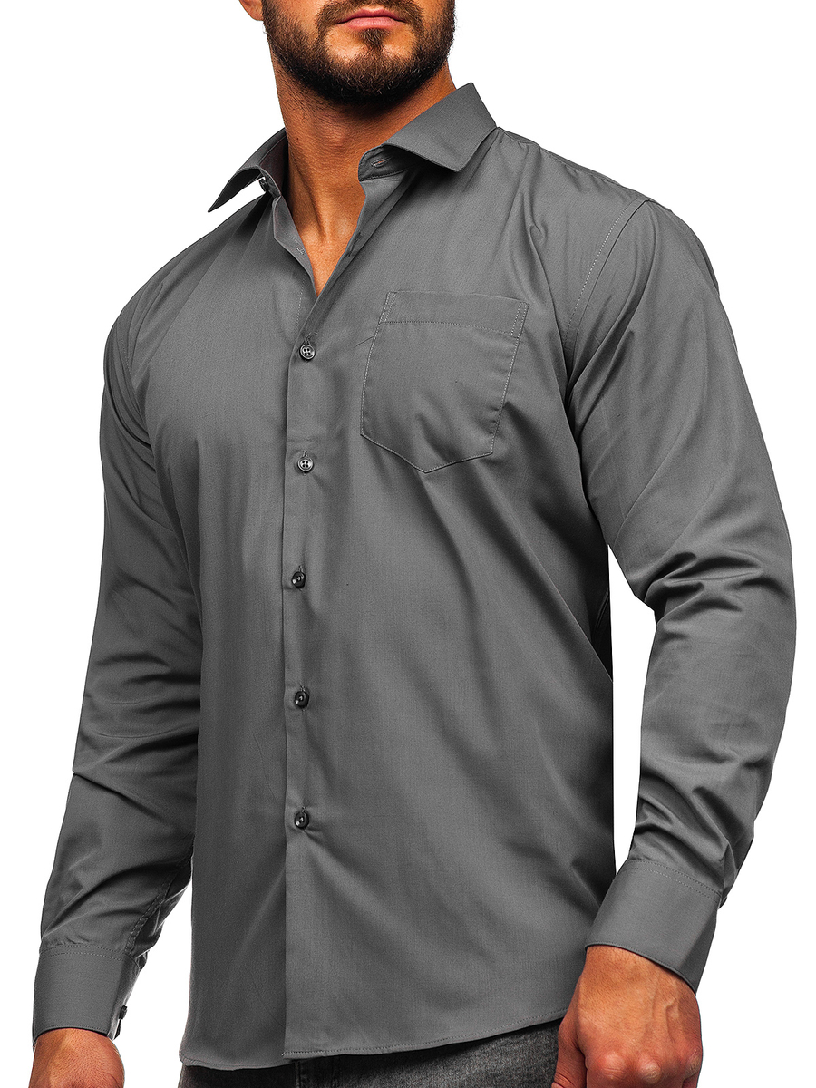 Grafit színű, hosszú ujjú, elegáns férfiing -Bolf M14- egy igazi must have minden férfi ruhásszekrényében. Hosszú ujjú, gombolható ing "olasz" típusú gallérral. Állítható, egysoros, egy gombos mandzsettával. Klasszikus ing kerekített alsó résszel, kis praktikus mellzsebbel. Tökéletes egy baráti kiruccanásra a klubba, vagy akár egy fontos találkozóra. Az ing basic jellege lehetővé teszi számos rendkívüli stilizáció létrehozását bármilyen alkalomra. Állítsd össze a saját elegáns outfited chinóval és zakóval. Casual viselethez válassz egyfarmert és egy bőrdzsekit.