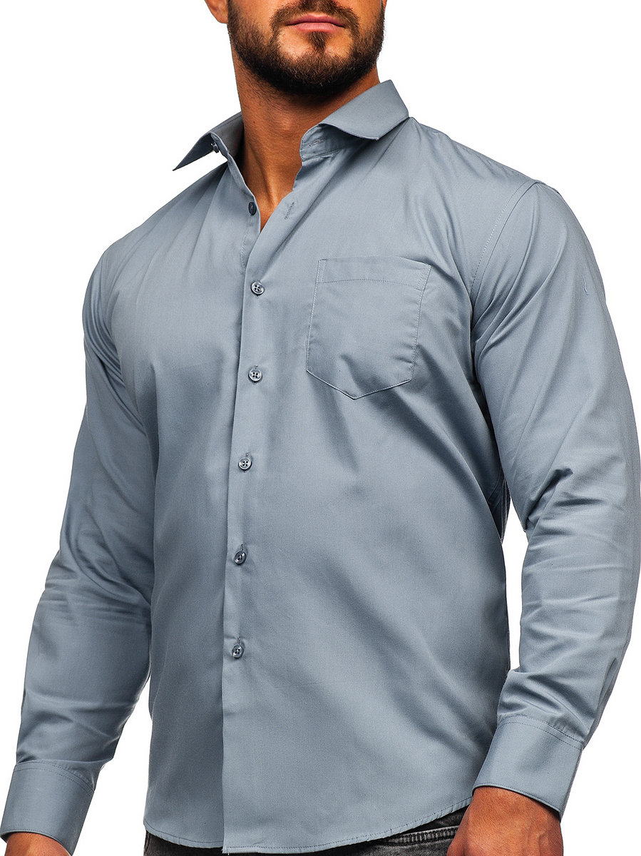 Antracitszürke színű, hosszú ujjú, elegáns férfiing -Bolf M14- egy igazi must have minden férfi ruhásszekrényében. Hosszú ujjú, gombolható ing "olasz" típusú gallérral. Állítható, egysoros, egy gombos mandzsettával. Klasszikus ing kerekített alsó résszel, kis praktikus mellzsebbel. Tökéletes egy baráti kiruccanásra a klubba, vagy akár egy fontos találkozóra. Az ing basic jellege lehetővé teszi számos rendkívüli stilizáció létrehozását bármilyen alkalomra. Állítsd össze a saját elegáns outfited chinóval és zakóval. Casual viselethez válassz egyfarmert és egy bőrdzsekit.
