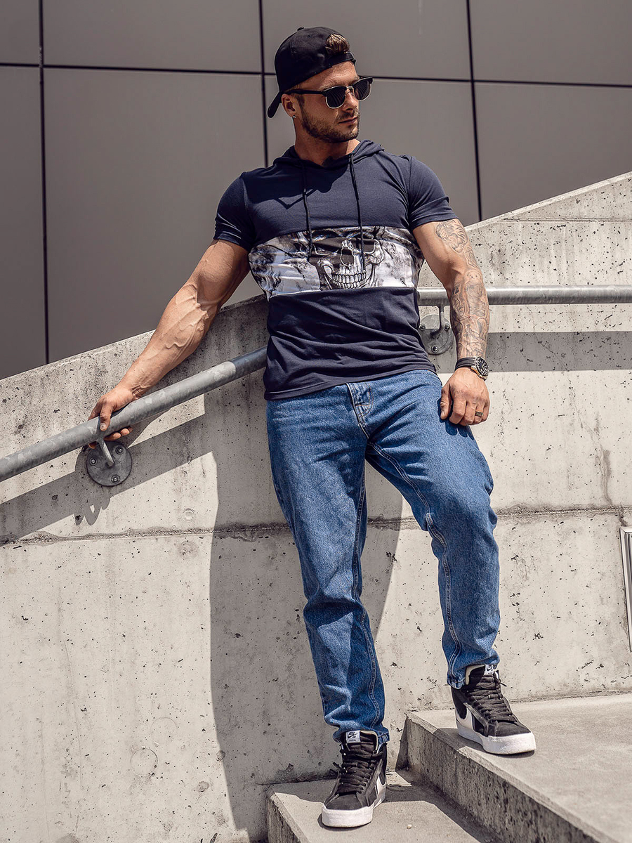 Gránátkék színű, férfi póló -Bolf 8T971A- nagyszerű ajánlat azoknak a férfiaknak, akik értékelik az egyedi, figyelemfelkeltő stílust. A hétköznapi és az utcai stilizációkban is megállja a helyét. Az univerzális szín megkönnyíti a kombinálhatóságát más ruhadarabokkal, az elején található nyomat rockos jelleget biztosít. Viseld slim fit farmerrel és motoros dzsekivel, megfelelő stilizációt biztosít esti baráti találkozásra vagy a koncertre. A slim fit fazon nagyszerűen kiemeli az alakot és a vállakat. Póló állítható kapucnival, mely tökéletesen véd a szél elől és nagyon dekoratív. Pamut és poliészter keverékéből készült, ennek köszönhetően rugalmas az anyaga és puha a tapintása, a póló rendkívül kényelmes. Gránátkék, fehér és fekete színben elérhető.