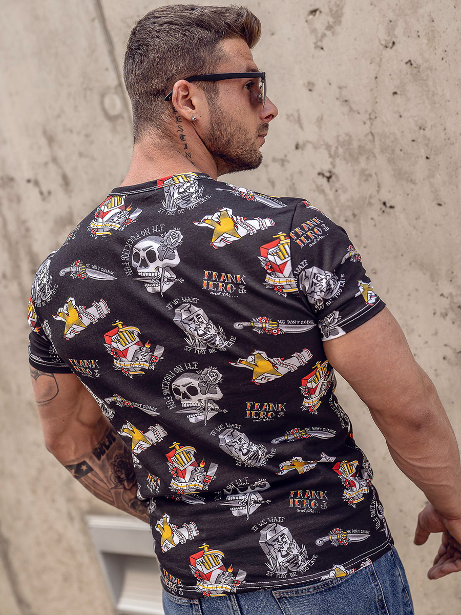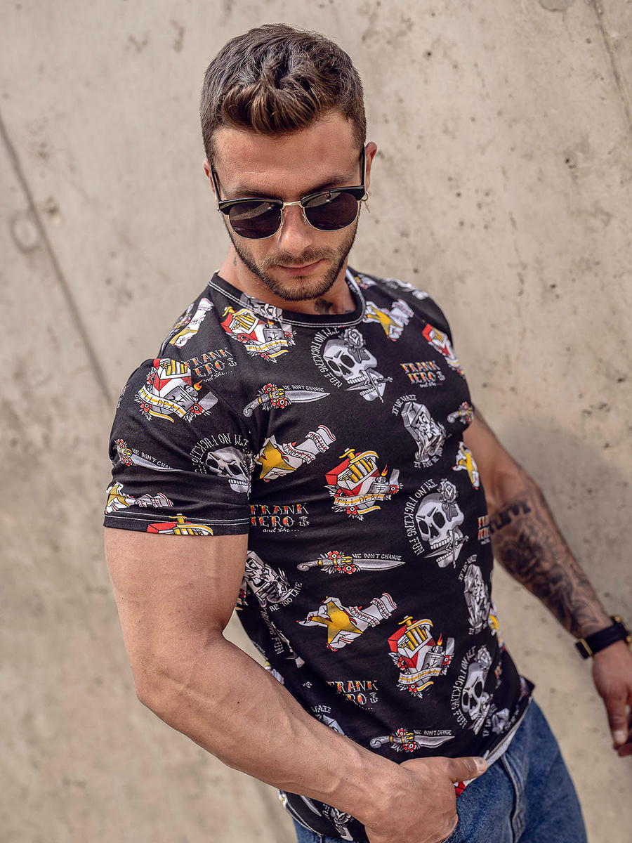 Férfi póló mintával -Bolf 14963A- ideális ajánlat azoknak a férfiaknak, akik nem félenek a mintáktól és szeretnek feltűnően öltözködni. Ideálisan megfelel találkozásra barátokkal, városi kiruccanásra vagy a hétköznapokra. 100% pamutból készült, ennek köszönhetően puha tapintású és rugalmas. A slim fit fazon tökéletesen kiemeli az alakot, a dizájnos minta a teljes felületen pedig divatos jelleget biztosít. Fantasztikusan mutat baggy típusú nadrággal. Néhány színben kapható.