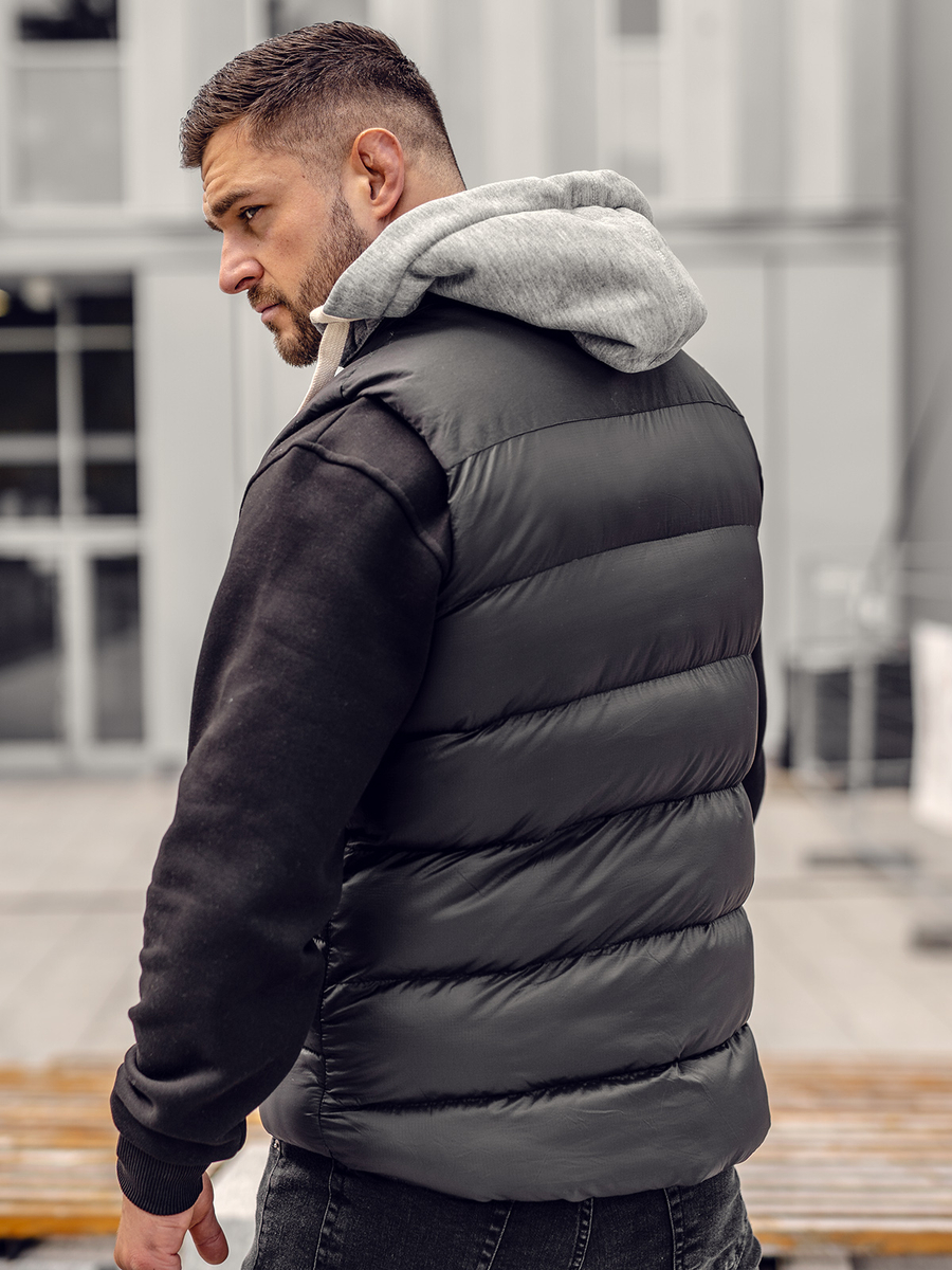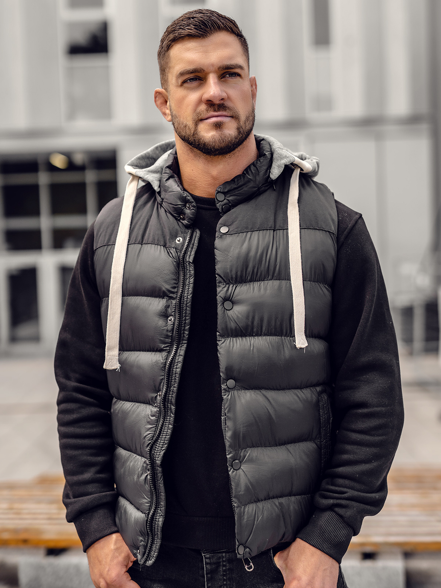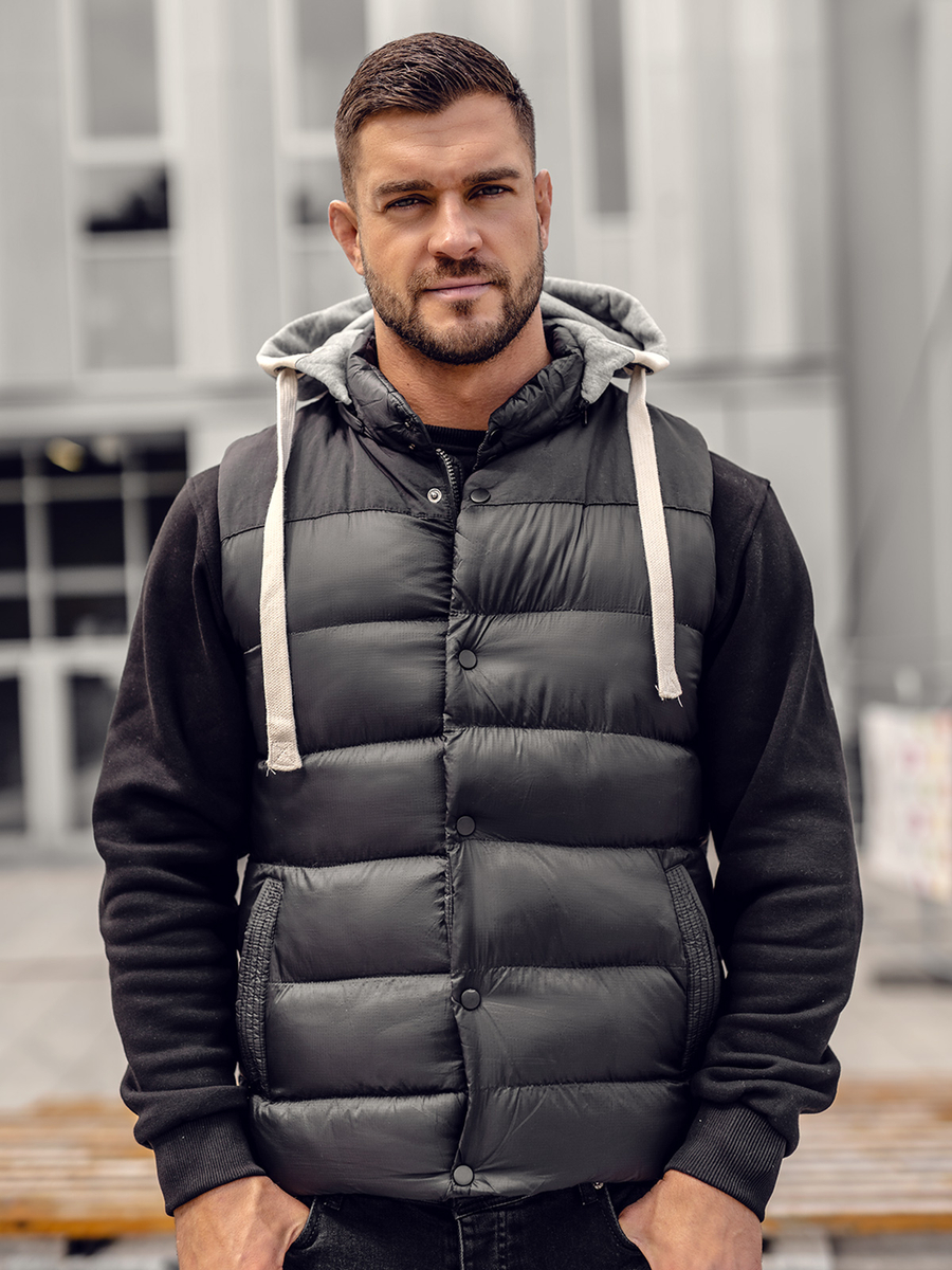 Fekete színű, steppelt férfi mellény kapucnival -Bolf 13078A- ideálisan beválik őszi és tavaszi stilizációkban. Mellény cipzáros és patentos zárral. Levehető, állítható kapucnival és állógallérral rendelkezik – ennek köszönhetően nagyon praktikus. Két külső, cipzározható zsebbel és egy belső zsebbel rendelkezik, amelyekben a legfontosabb tárgyaidat tárolhatod, mint például a telefon, a pénztárca vagy a dokumentumok. Ez a mellény néhány féle színben kapható. Klasszikus mellény sportos, egyenes fazonú. Tökéletes ajánlat azoknak a férfiaknak, akik sportolnak. Ideális hétköznapokra, városi kiruccanásra, találkozásra az ismerősökkel vagy esti sétára. Outfites stilizációt alkot hosszú ujjú felsővel és joggerrel. Nagyszerűen mutat párban melegítőfelsővel és farmerral.