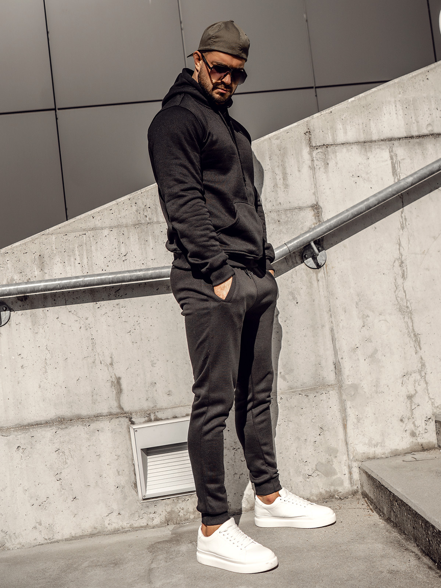 Fekete színű férfi melegítő kapucnival- Bolf D003A - egy tréning szett, amely nagyszerűen passzol bármilyen sporttevékenységhez. A szett egy kapucnis pulcsit és egy melegítőnadrágot tartalmaz. A nadrág állítható derékban erős megkötővel és szűkítővel és két zsebe van oldalt. Sportos jelleget az egyenes, testhezálló fazon biztosít. Finom, kellemes tapintású anyagból készült termék. A melegítő szett alapként szolgálhat hétköznapi és sportos stilizációk létrehozásában is. A pulcsi és a nadrág jól párosítható különböző ruhadarabokkal, ami széles lehetőségeket kínál a mindennapi stilizációk létrehozásához. A szett nagyszerűen mutat pólóval könnyű átmeneti dzsekivel vagy sportdzsekivel. A melegítő szett különféle helyzetekben is megállja a helyét, akár otthon, séta közben vagy bevásárláskor, valamint az edzőteremben vagy a szabadban végzett edzéseken is beválik.