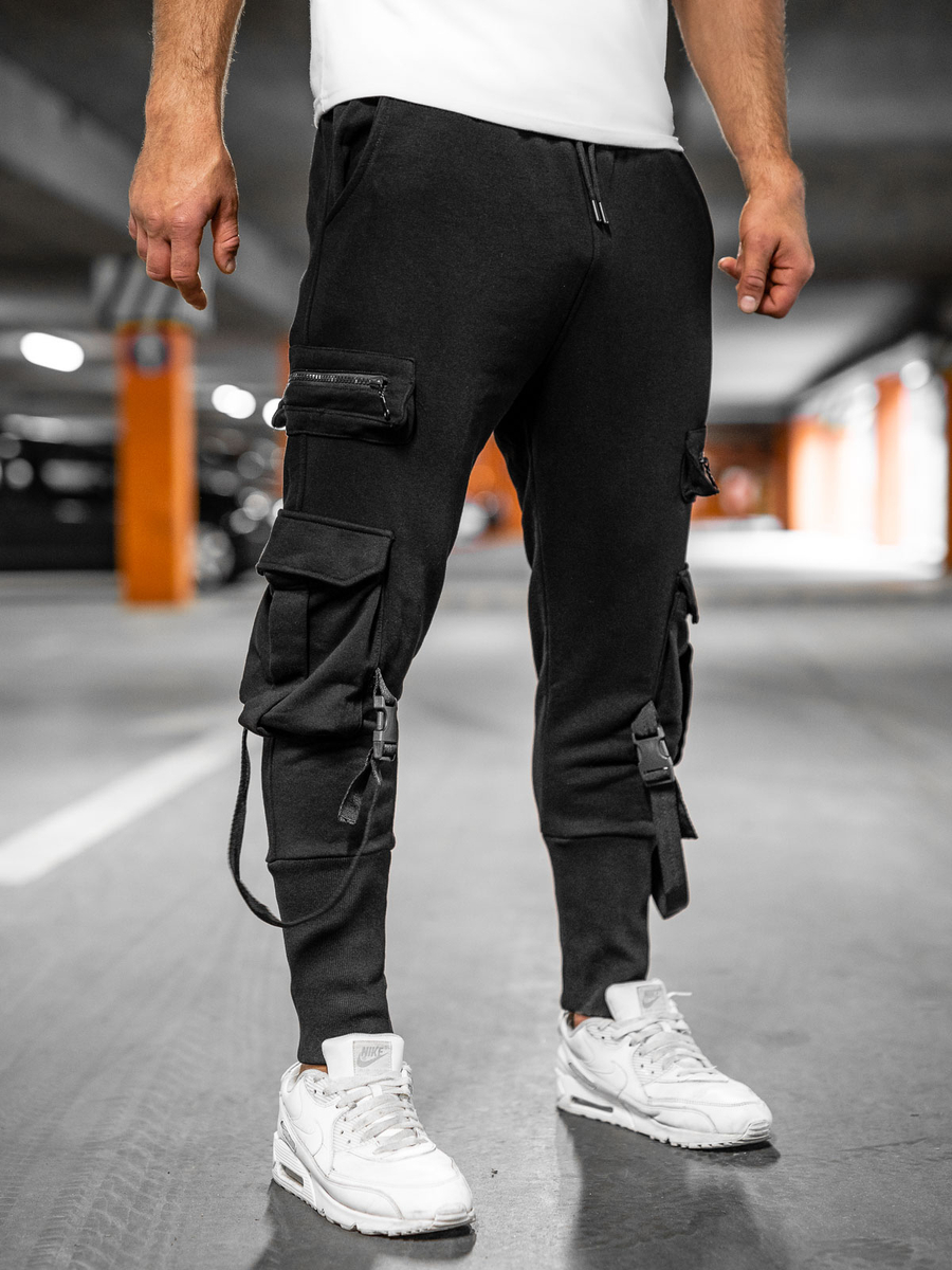 Fekete színű, katonai férfi melegítőnadrág - Bolf 6582A - a streetes stilizációk kedvelőinek. A katonai nadrág állítható derékban erős szűkítővel és megkötővel, nagyszerűen alakra szabott.70%-ban pamutból és 30%-ban poliészterből készült, ennek köszönhetően nagyon kényelmes és kellemes tapintású. A termék funkcionális és praktikus elemei a zsebek: két külső, zár nélküli zseb,, két kis oldalsó zsebfedős zseb és két cipzározható oldalsó zseb. Különleges kinézetet a dekoratív zárak az oldalsó zsebeken biztosítanak.Passzés lábszárral, ennek köszönhetően jól igazodik a testhez. A katonai nadrág perfect match-et biztosít melegítőfelsővel vagy pólóval.