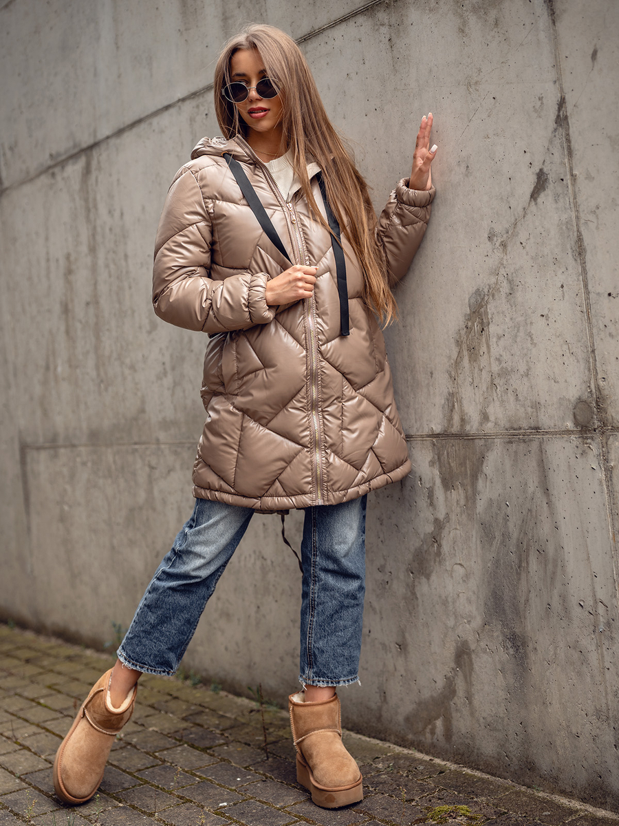 A felhasználók véleménye Camel színű hosszú steppelt téli női kabát kapucnival Bolf 5M3189