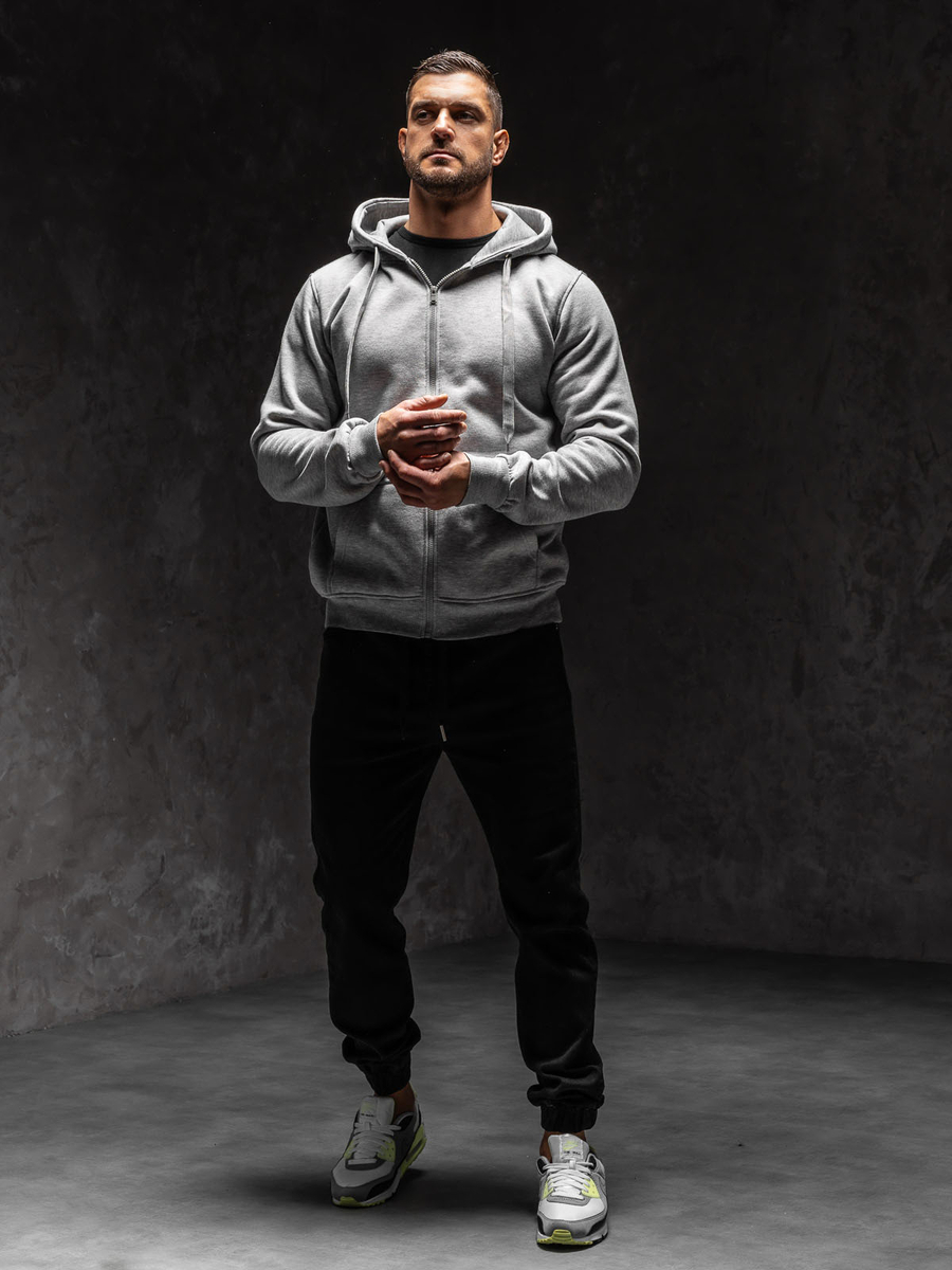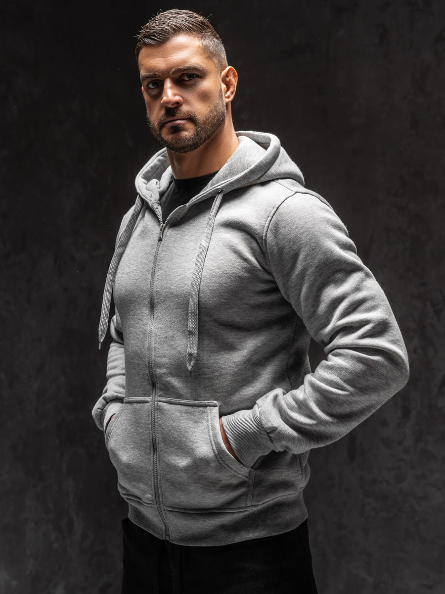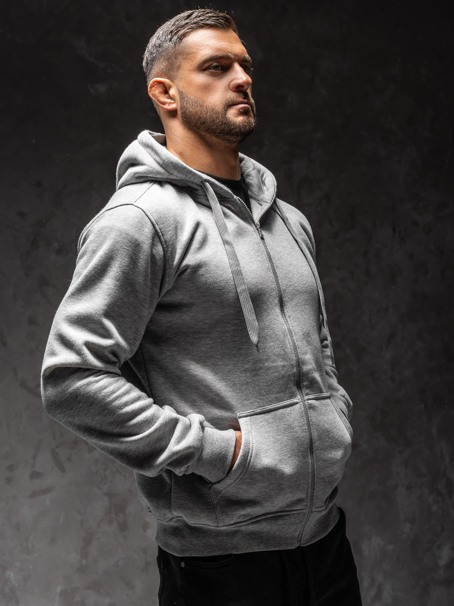 Szürke férfi cipzáros pulcsi kapucnival Bolf2008A1. Klasszikus szabású pulcsi, puha, kellemes tapintású melegítőanyagból készült. A termék több színben kapható, ami jellegzetessé teszi. Állítható kapucnival egységes színben és oldalsó zsebekkel. A pulcsi alja és az ujjai passzéval vannak ellátva.