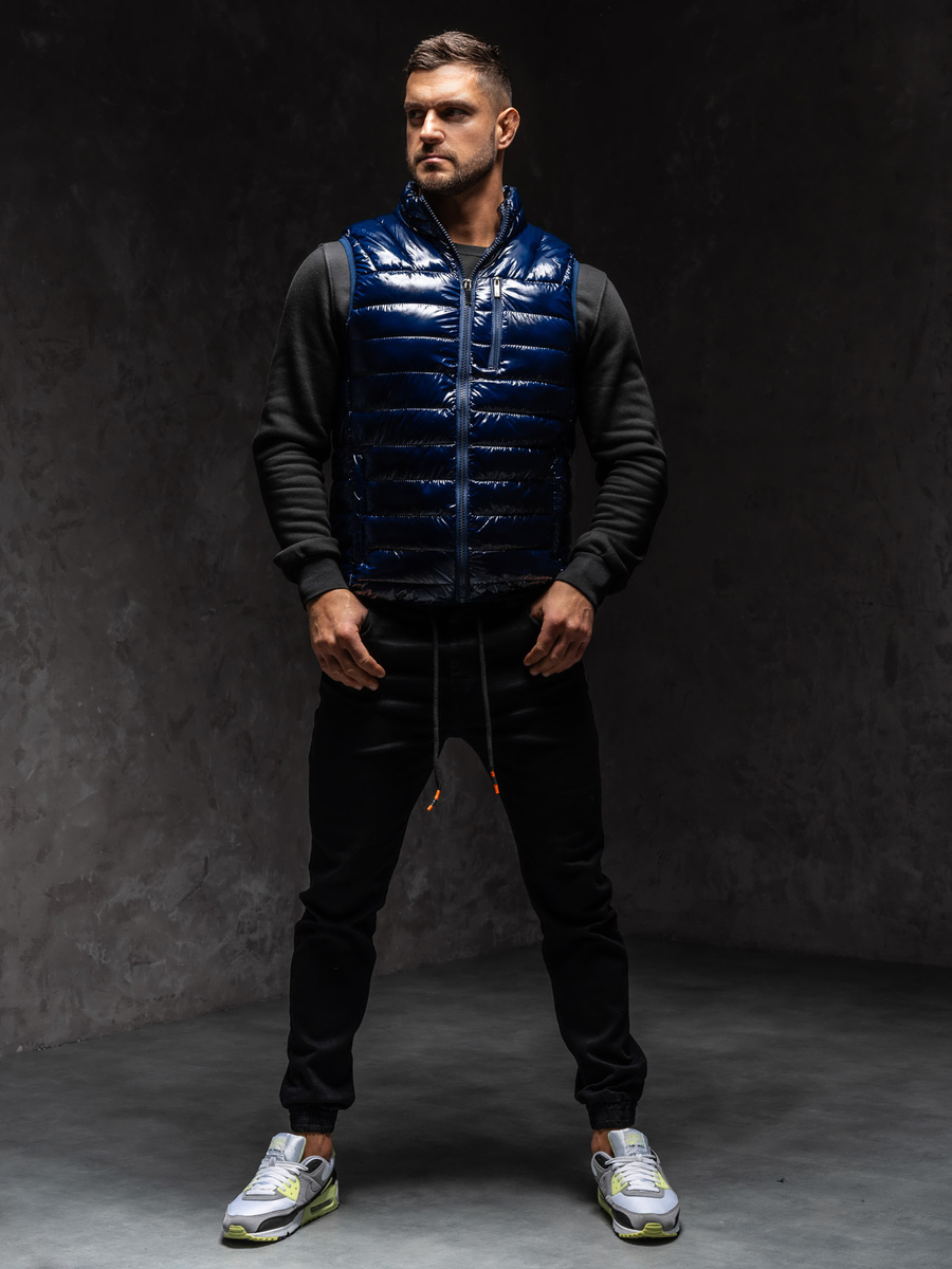 Sötétkék steppelt férfi mellény Bolf R0109AA1 nagyszerűen beválik sportos és városi stilizációk megalkotása során is. Ez a klasszikus szabású mellény nagyszerű alternatíva lehet a dzseki helyett az őszi szezonban, véd a hideg és a szél elől. Cipzározható, álló típusú gallérral. A két cipzározható, külső zseb praktikussá teszi a mellényt. Az alja és az ujjakon található nyílások rugalmas passzéval vannak ellátva. A mellény 100%-ban nejlonból készült. A mellény alapként szolgál különböző divatos stilizációkhoz, tökéletesen helyettesíti az átmeneti dzsekit. Fantasztikusan mutat párban melegtőnadrággal, mely sportos, lezser kinézetet biztosít. Tökéleetesen párosítható ezen felül farmerral és joggerrel. Viselheted amivel csak akarod: hosszú ujjú felső, pulcsi vagy póló!