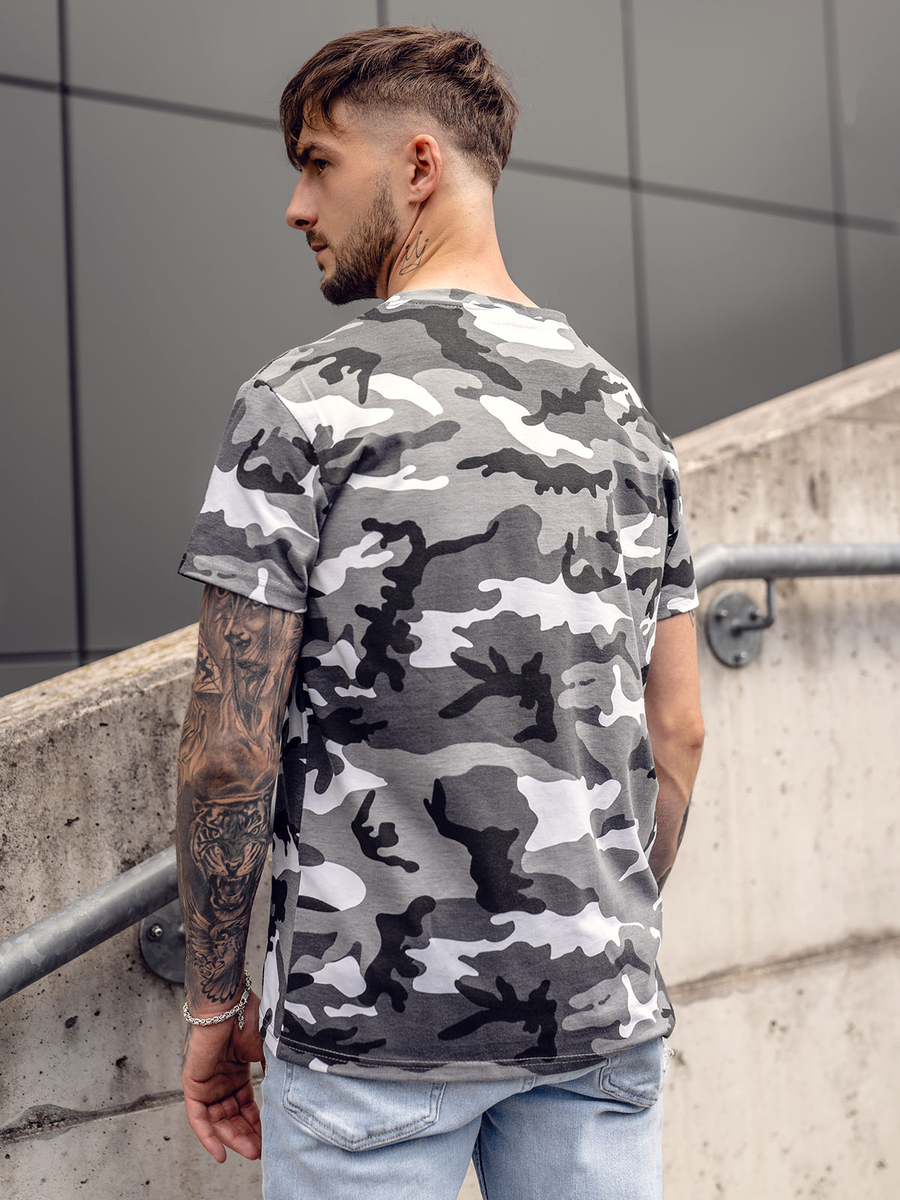 Szürke terepmintás férfi póló Bolf S807A1 divatos és időtlen terepmintával készült. A szemet gyönyörködtető szín nagyszerű kiegészítése lesz a ruhatáradnak. A póló kerek dekoltázzsal készül, melynek köszönhetően könnyedén bele lehet bújni. A póló alja kerekített, melynek köszönhetően minden alakhoz passzol. A póló rugalmas és nagyszerűen alakra szabott. Légáteresztő anyagból készült.