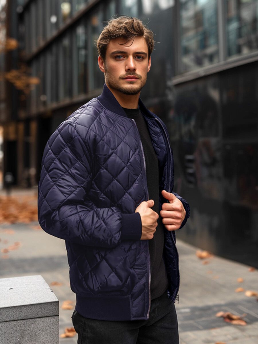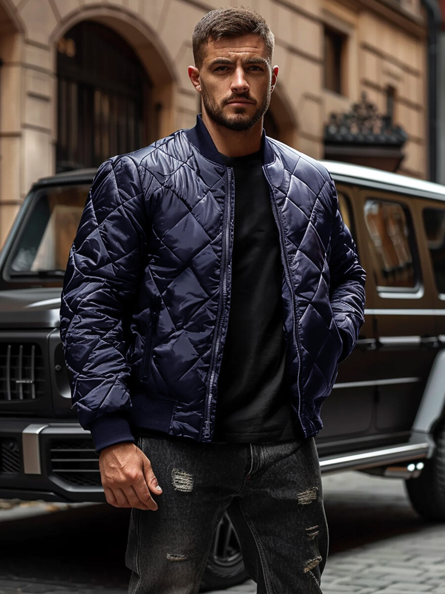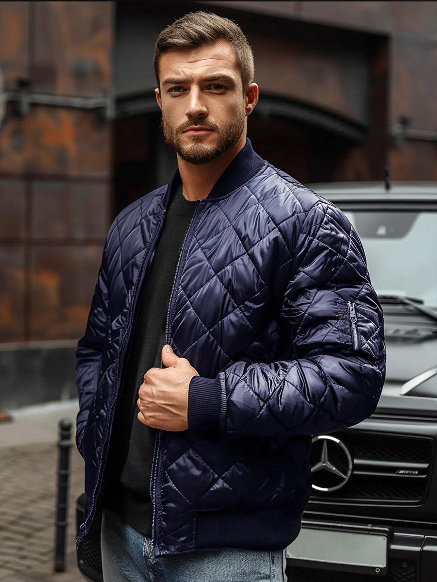 Sötétkék átmeneti férfi steppelt bomber dzseki Bolf MY-01A2 egy divatos, klasszikus a bomberdzsekik között. A dzseki az egyszerűségének és a kivitelezés minőségének köszönhetően időtálló és több évszakban is viselhető. A bomberdzseki nagyszerűen illeszkedik a legújabb trendekhez, kellemes tapintású anyagból készült. Rombusz alakú steppeléssel. Állógallérral rendelkezik, mely cipzározható. Az ujjak, a gallér és a dzseki alsó része széles, fekete szűkítőkkel van ellátva. Bomber, két praktikus, külső cipzáras zsebbel rendelkezik. További zárható zsebbel a bal ujjon
