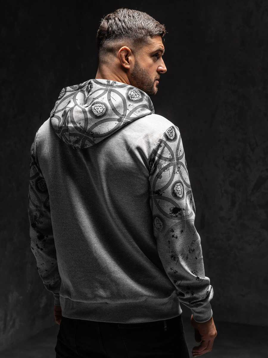 A szürke, cipzáras, kapucnis férfi pulóver Bolf 27B8122A1 egy időtlen klasszikus a mindennapi összeállításokban. Klasszikus szabású melegítőfelső, állítható kapucnival, ideális a sportos stilizációkhoz. Egyedi, divatos jelleget a dizájnos nyomat biztosít. A pulcsi alsó része és az ujjai passzésak, ennek köszönhetően melegen tart és védelmet nyújt a szél ellen a hűvösebb napokon. Melegítőfelső, két nyitott zsebbel Nagyon kellemes az anyaga, mely kényelmet biztosít keményebb edzés közben. Sportos outfitet keresel? A melegítőfelsőt párosítsd melegítőnadrággal, pólóval és mellénnyel!