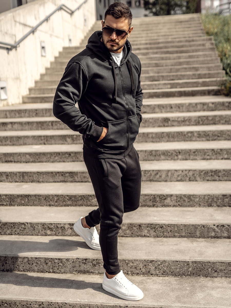 A fekete, kapucnis cipzáras Bolf D004A férfi melegítő tökéletes választás minden alkalomra és évszakra. A szett egy kapucnis felsőt és melegítőnadrágot tartalmaz. A klasszikus szabású felső cipzárral rendelkezik. Gyakorlati kapucnija és két oldalsó zsebe van. A felső alja és ujjai passzéval vannak ellátva, ami meleget és védelmet nyújt a szél ellen hűvösebb napokon. A nadrág derékrésze erős passzéval és zsinórral állítható, és két oldalsó zsebbel is rendelkezik. Sportos jelleget az egyenes, testhezálló fazon biztosít. Finom, kellemes tapintású anyagból készült termék. A melegítőszett univerzális alapot képezhet mindennapi vagy sportos öltözetekhez. Többféle, különböző színváltozatban kapható. A széles színválasztéknak köszönhetően nemcsak megtalálod a számodra megfelelő darabot, hanem minden nap a saját stílusodhoz igazíthatod a melegítőt. A szett tökéletesen illik egy pólóhoz egy könnyű átmeneti kabáttal vagy egy sportos felsővel.