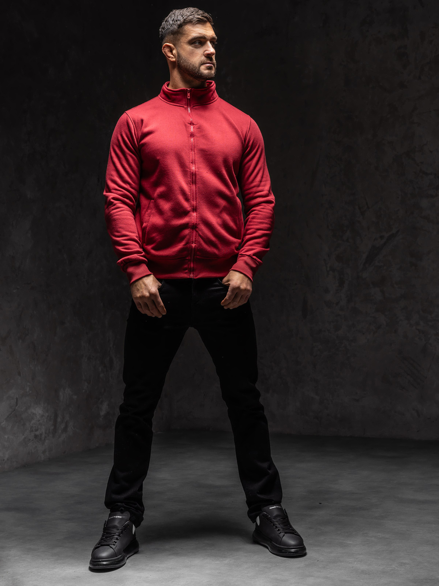 A bordó, cipzáras férfi pulóver kapucni nélkül Bolf B002A1 teljesen sima. Cipzározható. Jól mutat sportos és hétköznapi stilizációkban, nagyszerű kiegészítése a streetes outfitteknek is. Állógallérral rendelkezik. Nincs zsebe. Az ujjak és a pulcsi alsó része passzés. A pulcsi az egyszerűségének és a kivitelezés minőségének köszönhetően időtálló és több évszakban is viselhető. Tökéletesen illeszkedik a modern trendekhez, könnyű, kellemes tapintású, meleg melegítőanyagból készült. Sportos stílusú pulcsi, ideálisan beválik a hűvösebb napokon, viselheted vékony pólóval vagy hosszú ujjú felsővel.