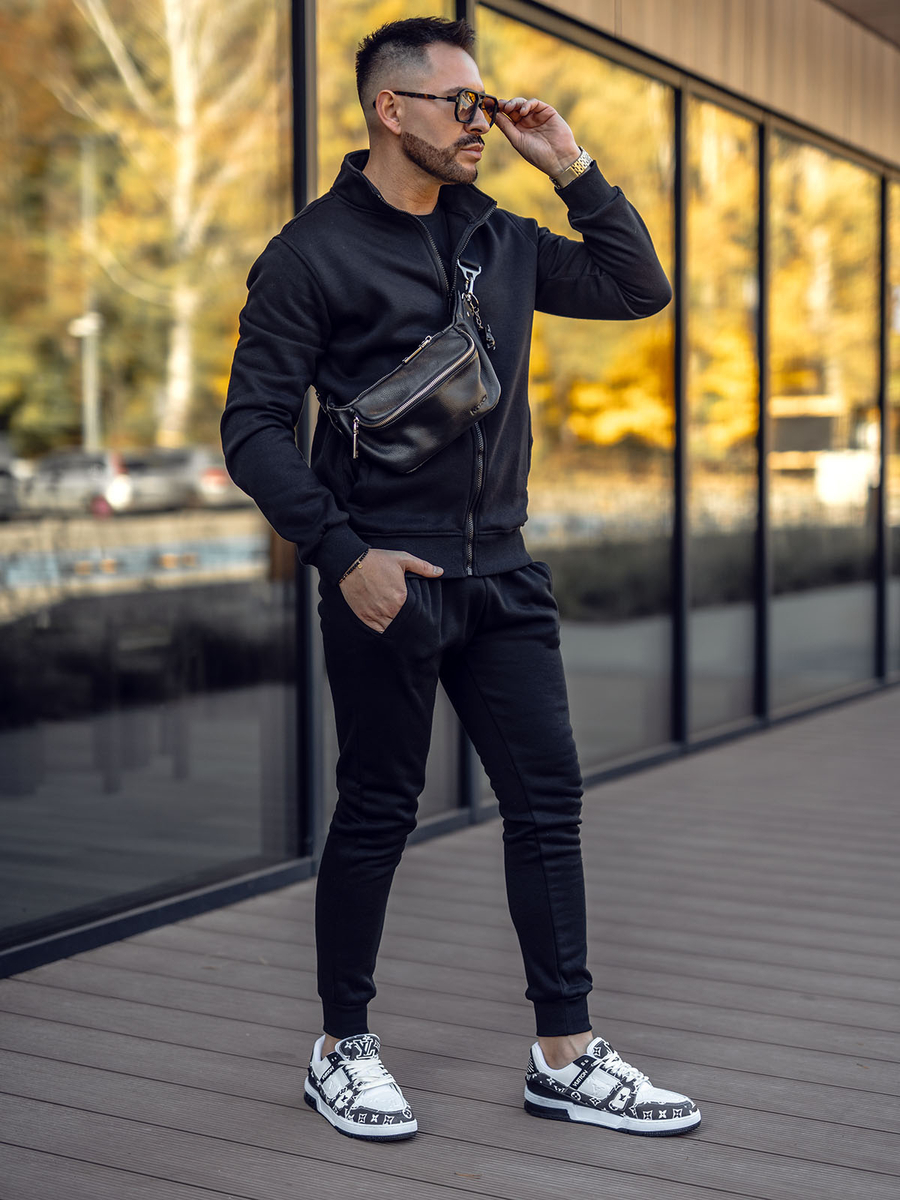 A Bolf 10385A2 fekete férfi melegítő egy sportos melegítőszett, amely egy pulóvert és melegítőnadrágot tartalmaz. A pulcsi zipzáras és külső zsebekkel rendelkezik. A nadrág derékban erős szegéllyel és húzózsinórral állítható és két külső zsebbel van ellátva. Sportos jelleget az egyenes, testhezálló fazon biztosít. Finom, kellemes tapintású anyagból készült termék. A melegítő szett alapként szolgálhat hétköznapi és sportos stilizációk létrehozásában is. A pulcsi és a nadrág jól párosítható különböző ruhadarabokkal, ami széles lehetőségeket kínál a mindennapi stilizációk létrehozásához. A szett nagyszerűen mutat pólóval könnyű átmeneti dzsekivel vagy sportdzsekivel.
