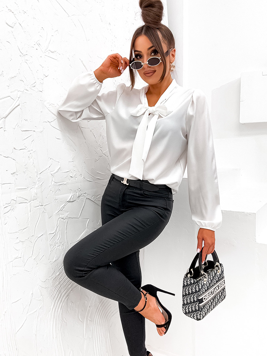 A felhasználók véleménye Fehér elegáns hosszú ujjú női blúz masnival Bolf 500