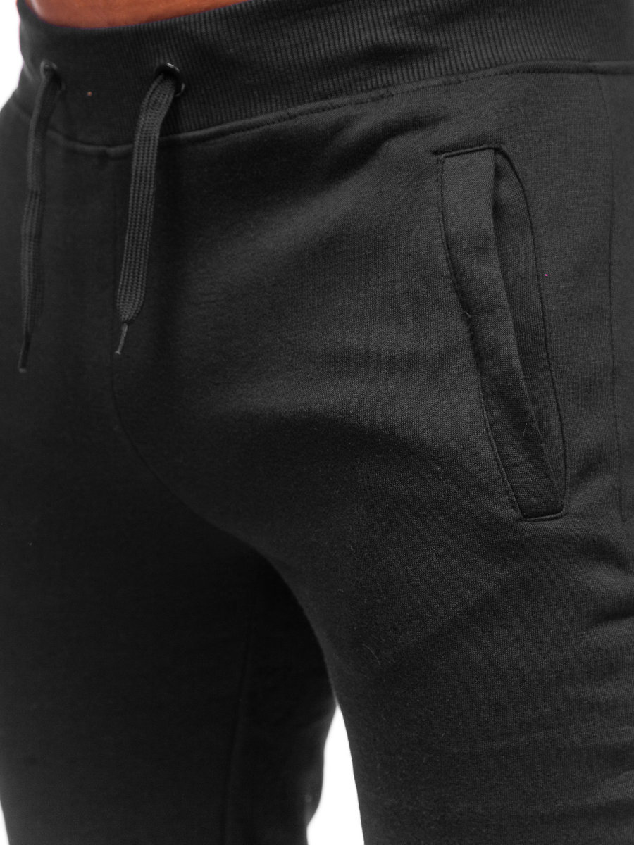 Fekete férfi melegítőnadrág Bolf XW01-E, klasszikus szabású melegítő, amely széles színválasztékban kapható. A nadrág állítható derékban megkötővel és szűkítővel és két zsebe van oldalt. A sportos kinézetet az egyenes fazon és a lábszárakon található passzé biztosítja. A termék finom, kellemes tapintású anyagból készült és nagyszerűen illeszkedik a testhez.